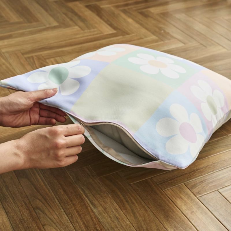 ファスナー仕様で出し入れも楽に。洗濯可の生地なのでお洗濯も簡単です! ※クッション中材は付属しておりません。45×45cmの中材を別途お買い求め下さい。