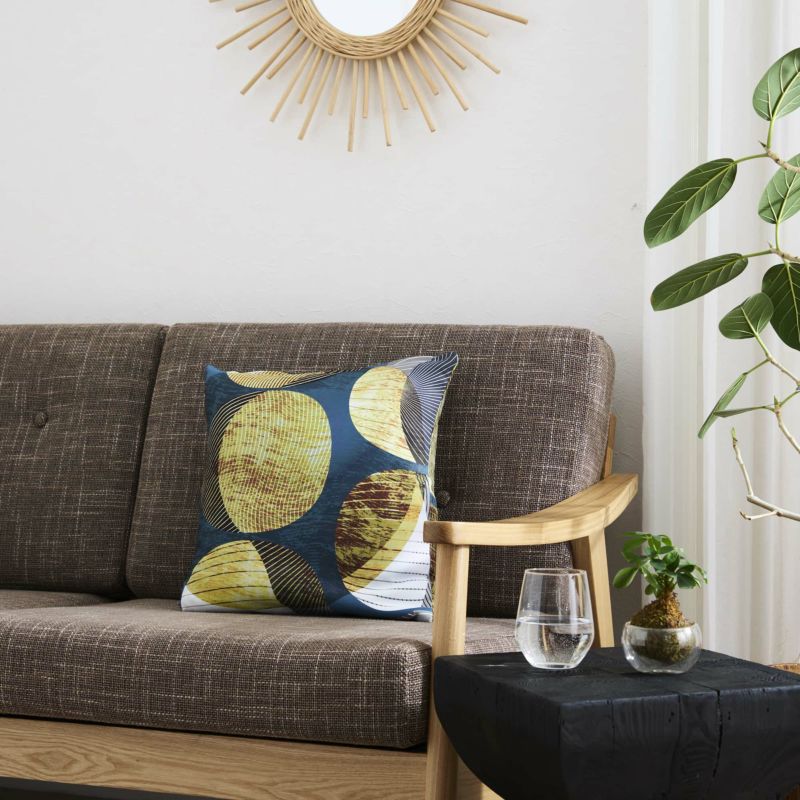 当店のアフリカンカテゴリのためにデザインした、世界にここだけにしかない特別なオリジナルプリントです。他の人と同じじゃつまらない、という個性派のあなたにぴったり! ベースの色は、強いカラーではなく、あえてニュアンスのあるアースカラー「ブルーグレー」でシックな雰囲気にしているので、ヴィンテージテイストの木の家具や床の色にしっくりと馴染みます。