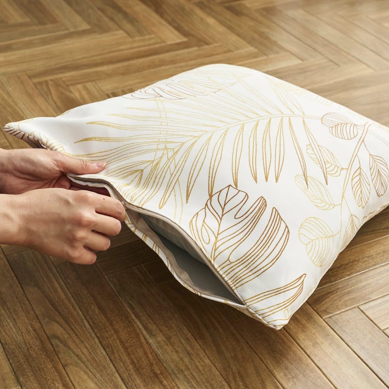 ファスナー仕様で出し入れも楽に。洗濯可の生地なのでお洗濯も簡単です! ※クッション中材は付属しておりません。45×45cmの中材を別途お買い求め下さい。