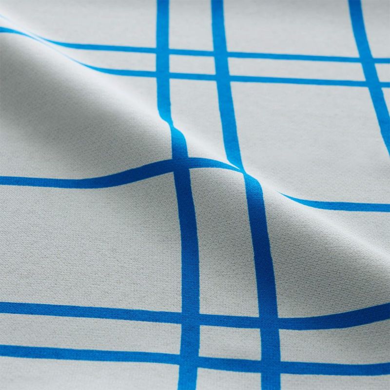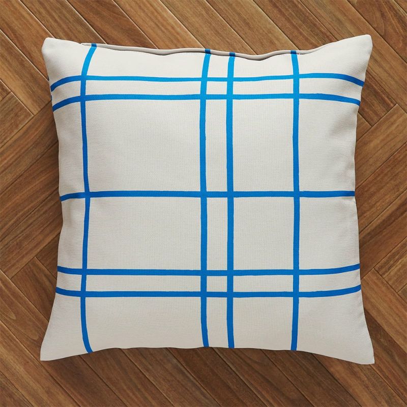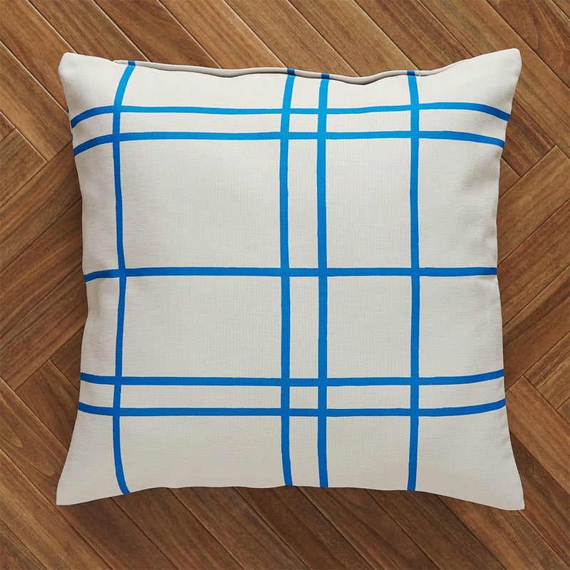 地図を真上から覗いたようなブルーラインのチェック、クリームチーズのようなミルキーなカラーリングがかわいい、ニュートロポップなオリジナルカーテンと同柄クッションカバーです。