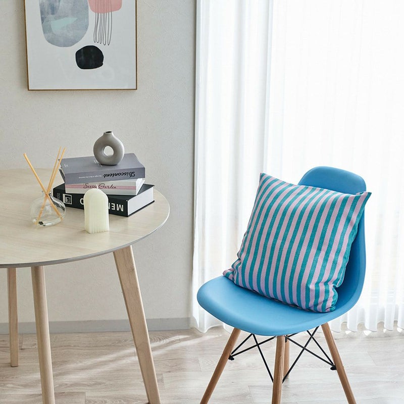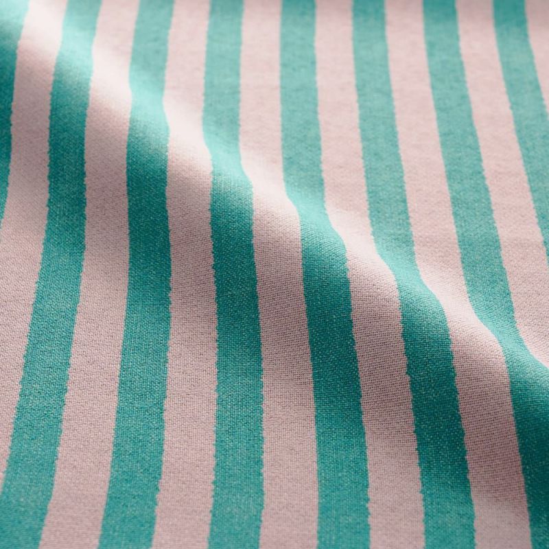 トレンドであるピンク×グリーンの配色が目を惹く、ストライプデザインのカーテンと同柄クッションカバーです。 マーケットのおしゃれな縞模様屋根に着目し、トレンドのくすみ感あるカラーリングでおしゃれに仕上げました。淡いカラーリングで今風のテイストを取り入れつつも、エモーショナルな個性を演出する1枚です。