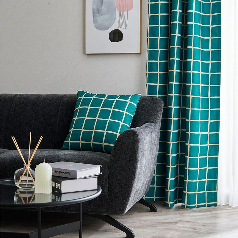 ハーマングリッドと呼ばれる錯視からインスピレーションを受けたような、格子柄のカーテンと同柄クッションカバーです。有名な錯視のように、クロスするポイントにぼんやりとしたカラーをつけた、遊び心のあるデザインが最高にかわいい!