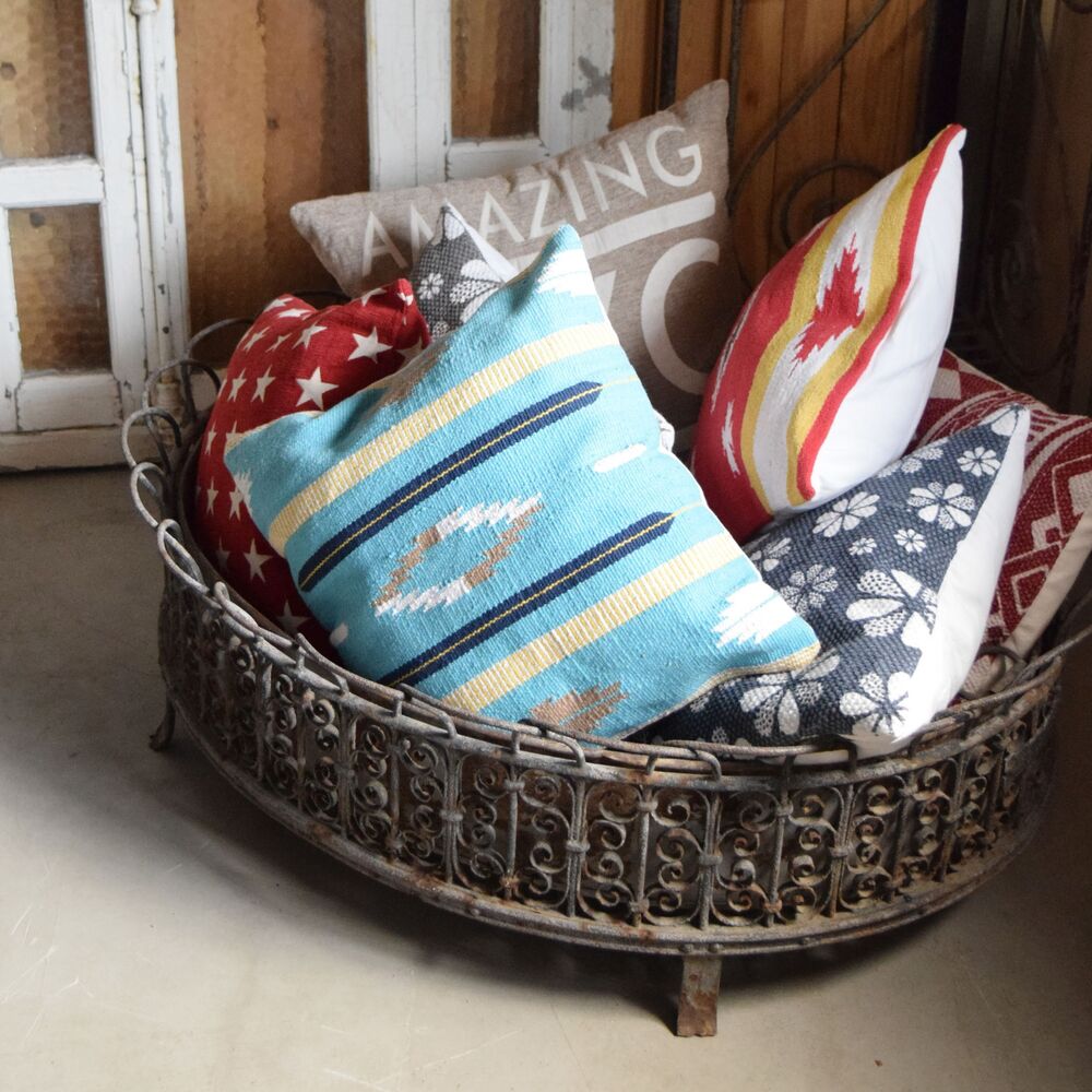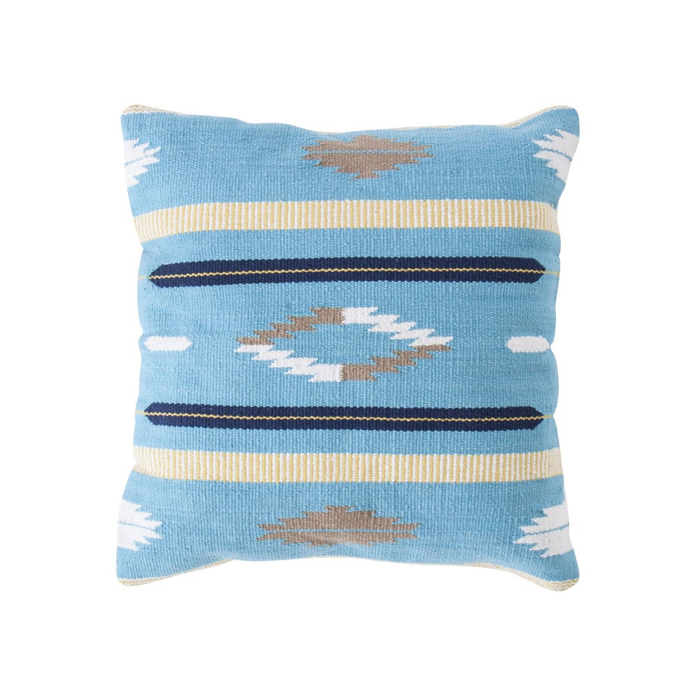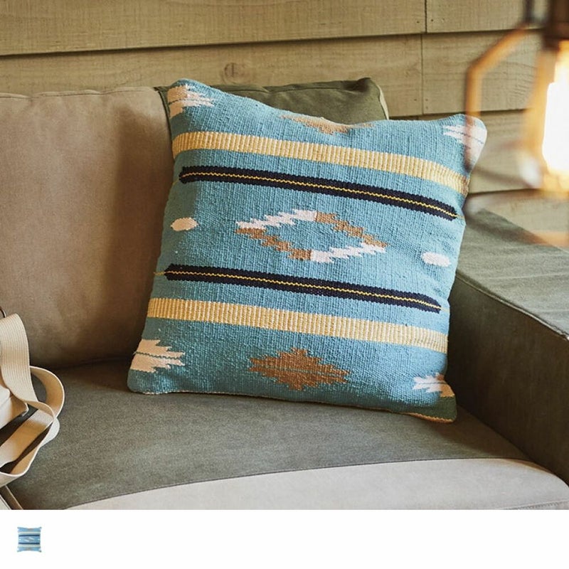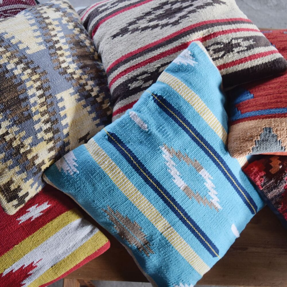 ダイヤ型のモチーフとストライプを組み合わせた、どこか懐かしさを感じるネイティブデザインのクッションです。