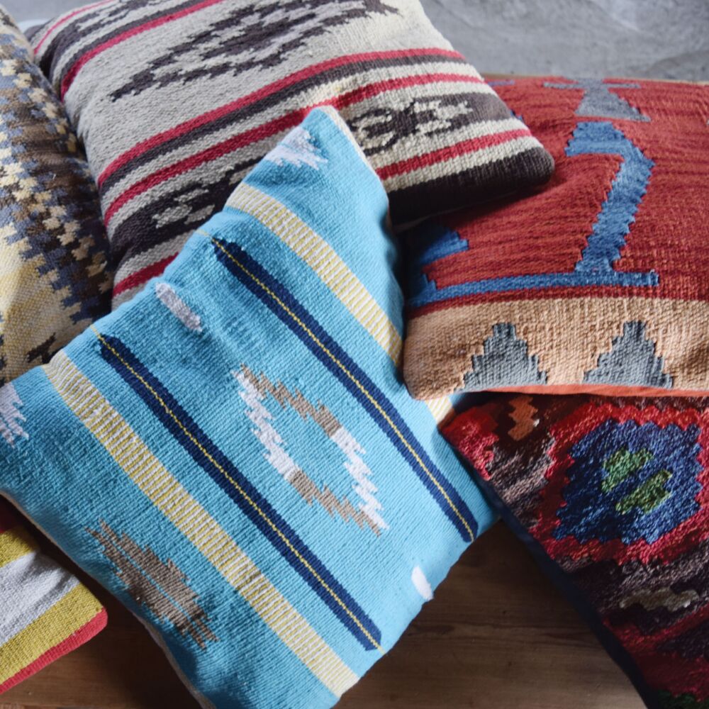 どこか民族的な雰囲気を感じさせるデザインは、シンプルなお部屋にもスッと馴染みつつ、ほどよいスパイスを加えてくれます。 赤みを帯びたレンガ色と落ち着いたブルーの組み合わせが印象的で、ソファやベッド、チェアに置くだけで一気に雰囲気のある空間に◎