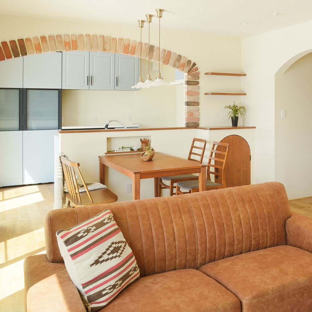 生成り×ブラウンに、さりげなく効いた赤のアクセントが、空間にほどよいリズムを与えてくれます。