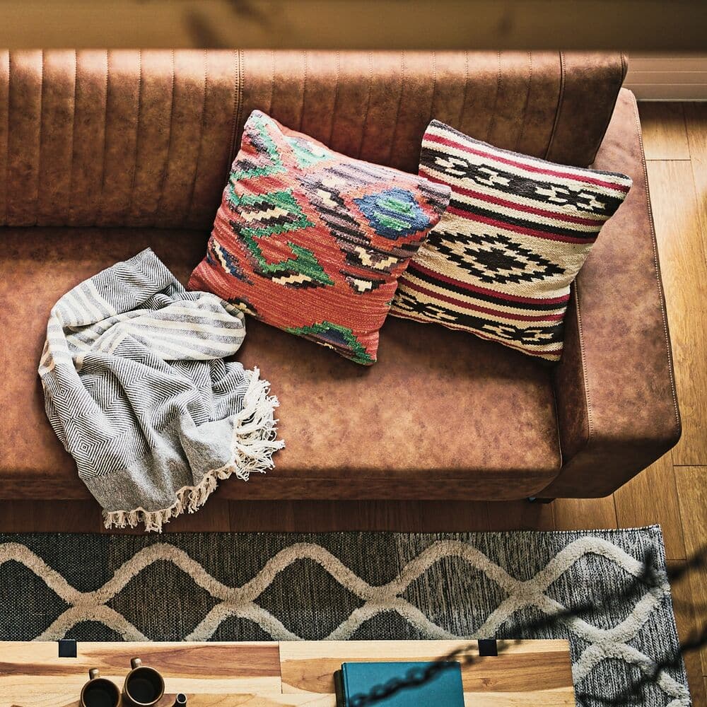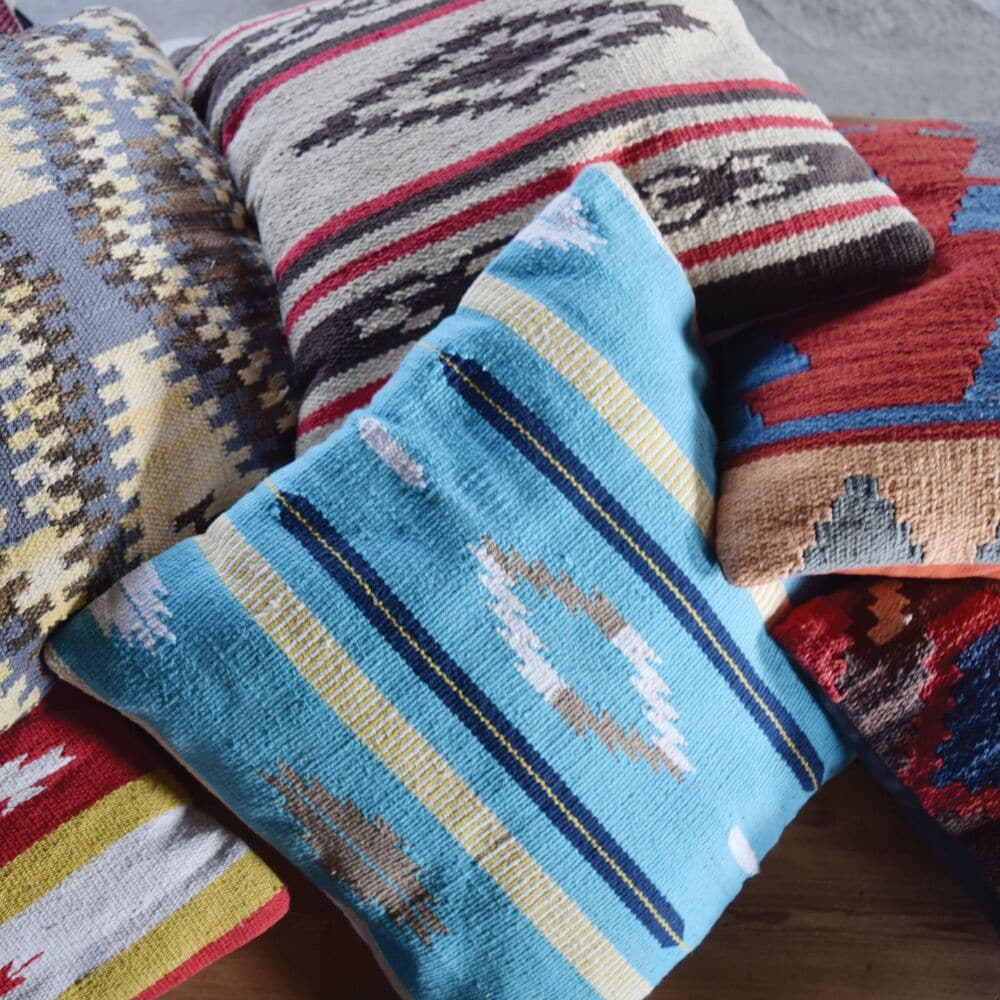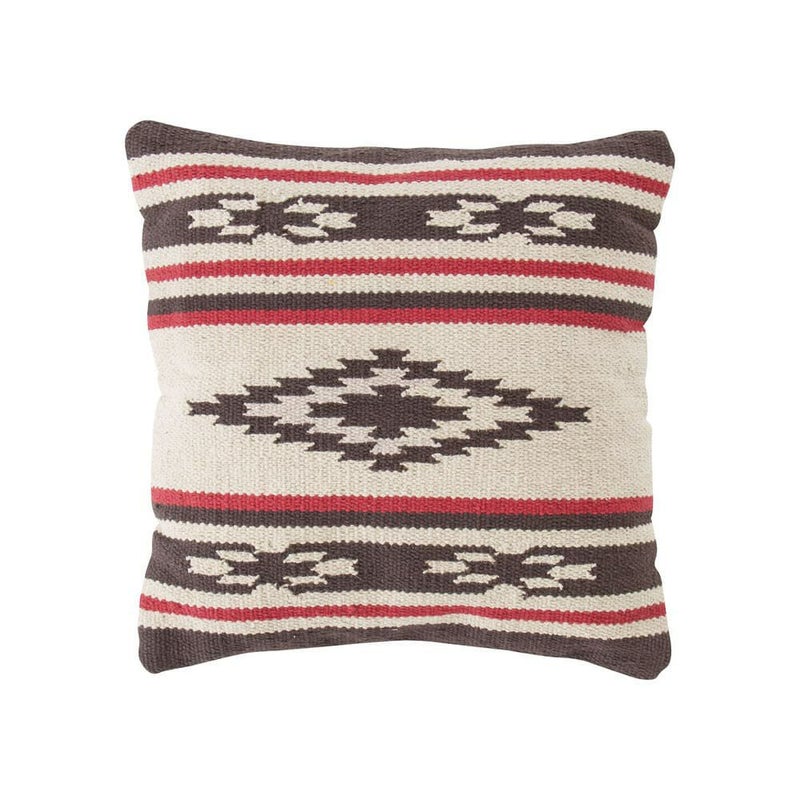 ダイヤ型のモチーフとストライプを組み合わせた、どこか懐かしさを感じるネイティブデザインのクッションです。