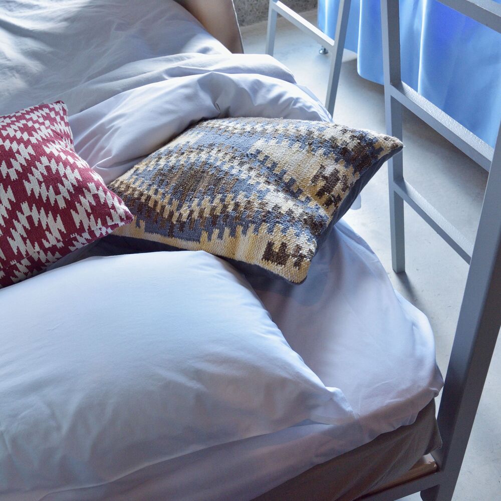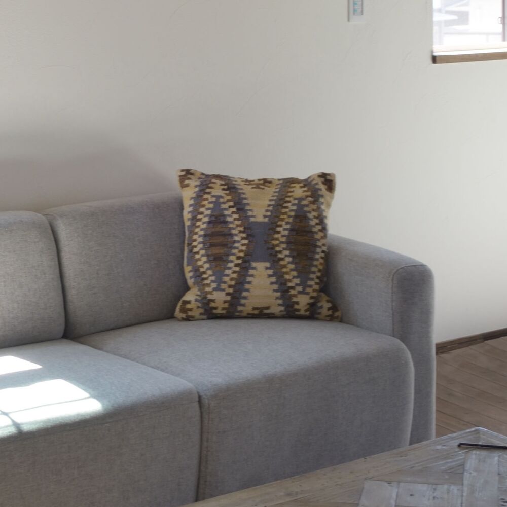 落ち着いた色合いで大胆なキリム模様がデザインされたクッションです。