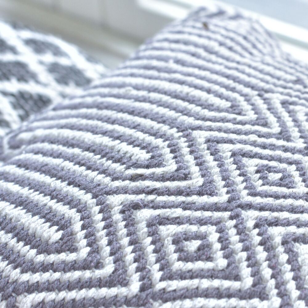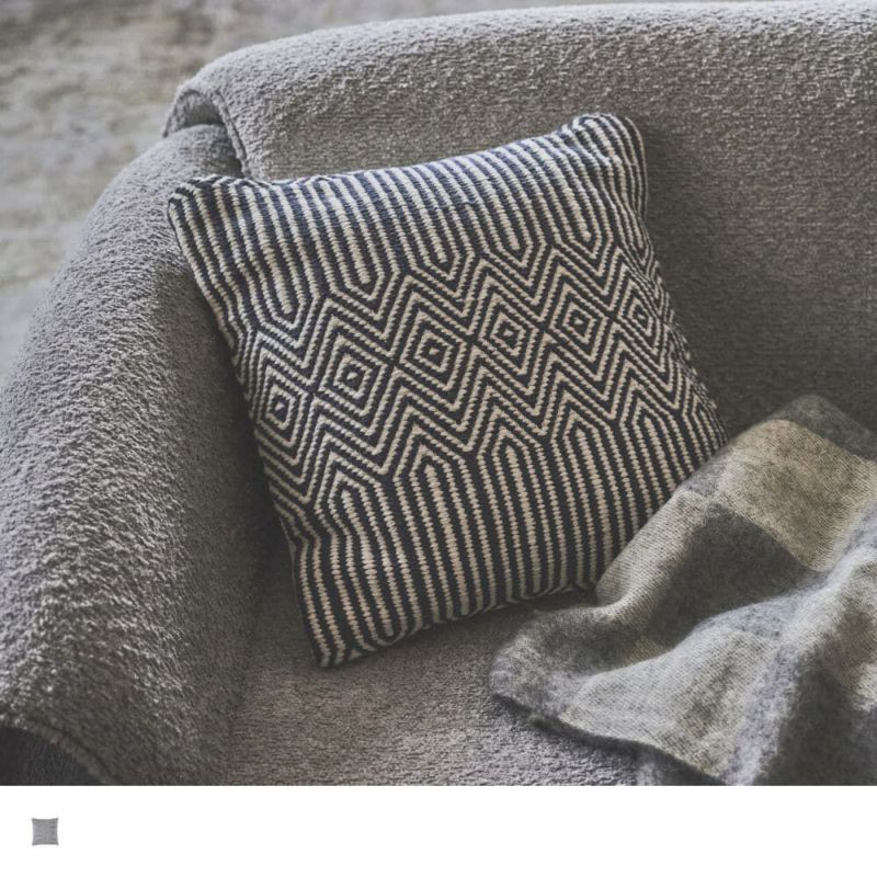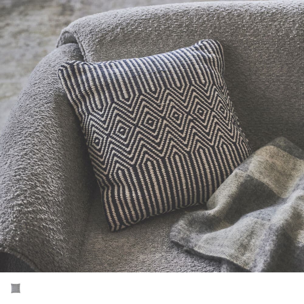 お部屋にリズムと奥行きを与える、個性的な幾何学パターンのクッションです。