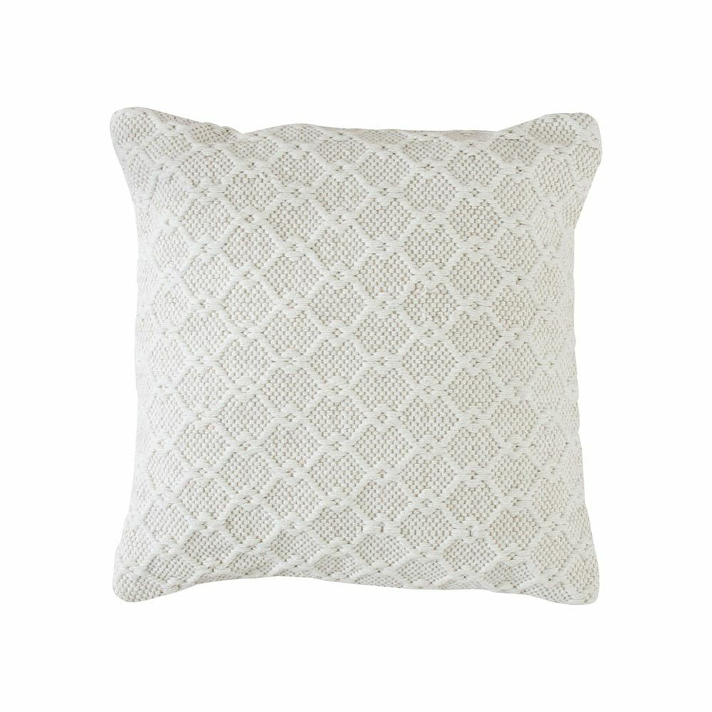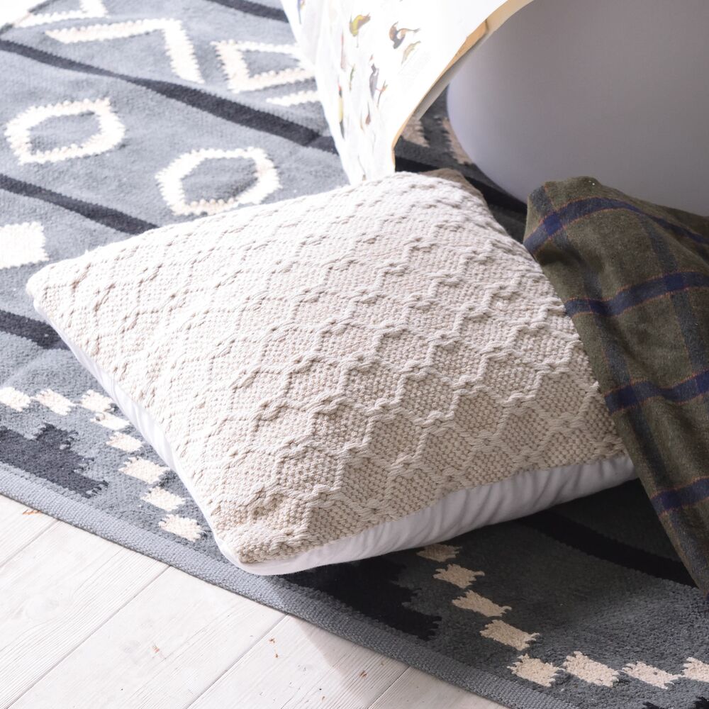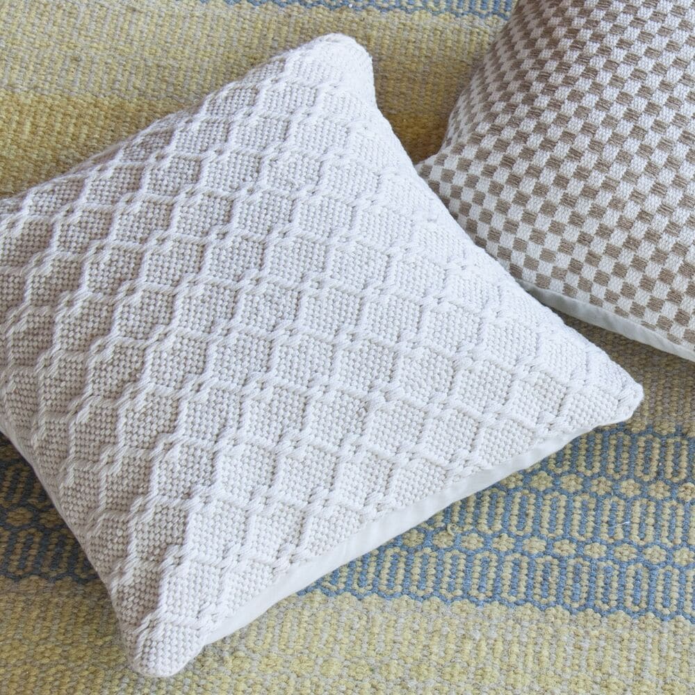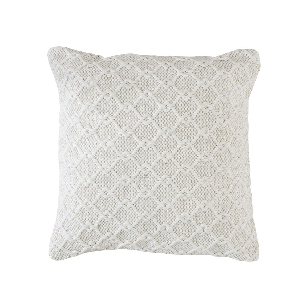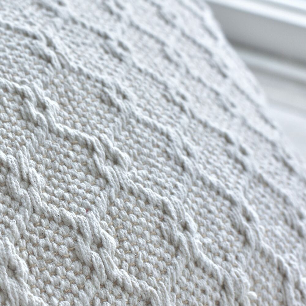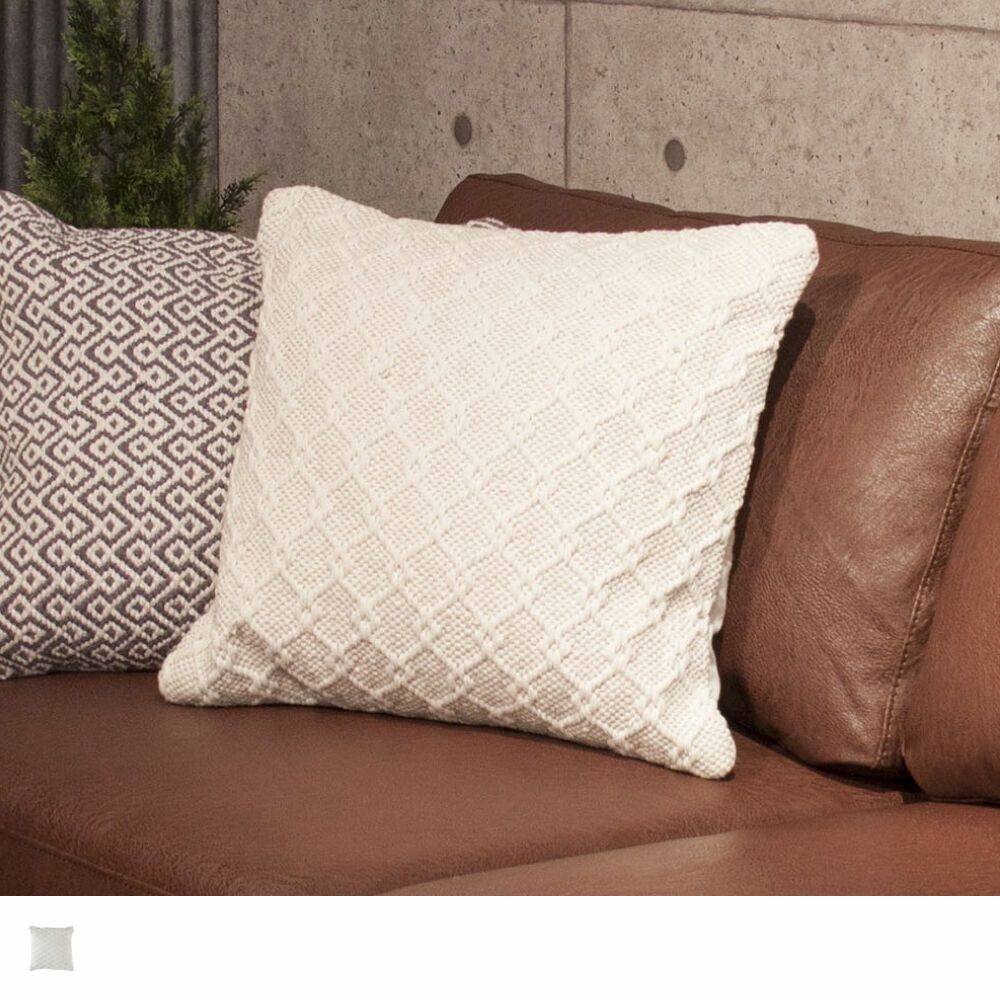 清潔感のあるホワイトと、立体的なダイヤモンド柄が特徴的なクッションです。
