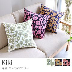 <Kiki>のカーテンと同じ生地で作ったクッションカバーです。