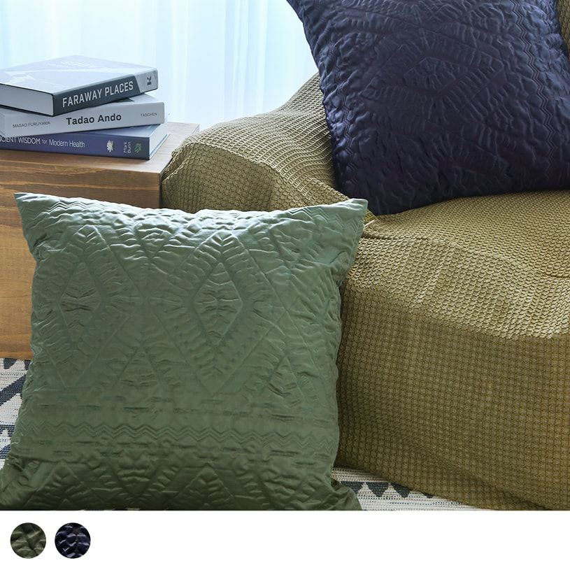 アメリカ空軍パイロットのフライトジャケット「MA-1」を彷彿させるミリタリーなデザインに惹かれ、バイヤーが買い付けたこだわりテキスタイルだ。インテリアのアクセントにプラスワン。おしゃれにマッチするクッションカバー