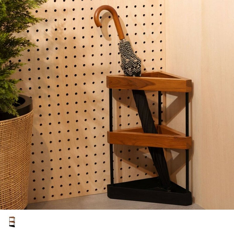 美しいチーク材の木目とマットブラックのアイアンが調和した上質感あふれる傘立て。