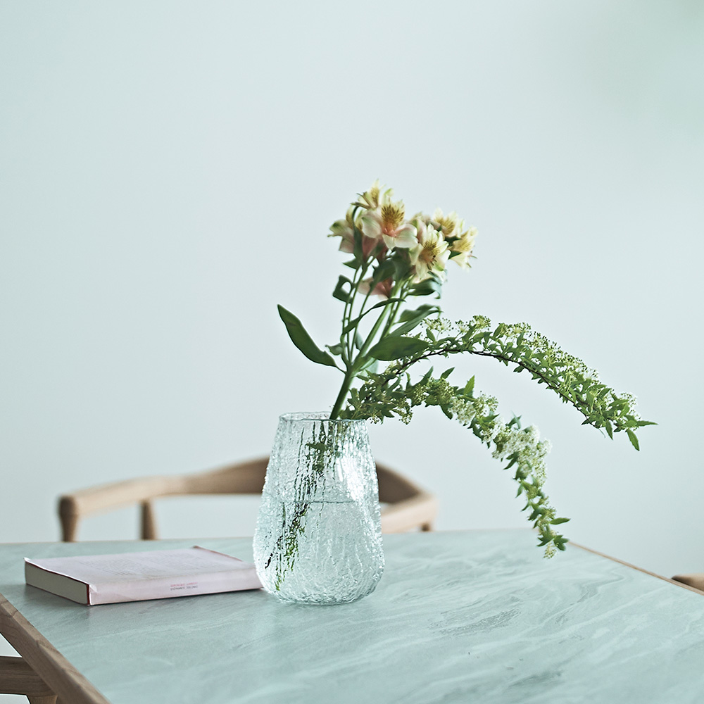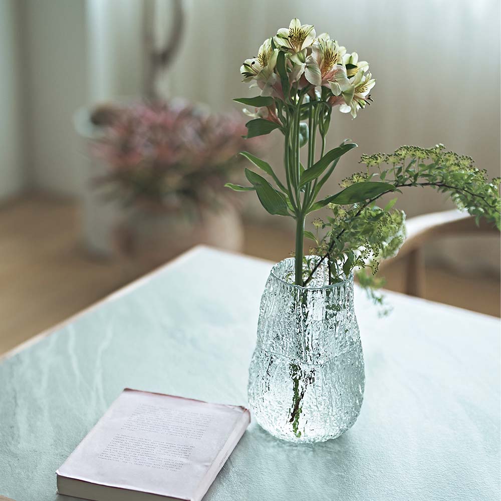 不揃いな凹凸が光を柔らかく乱反射させ、生けた植物の表情を豊かに見せてくれます。