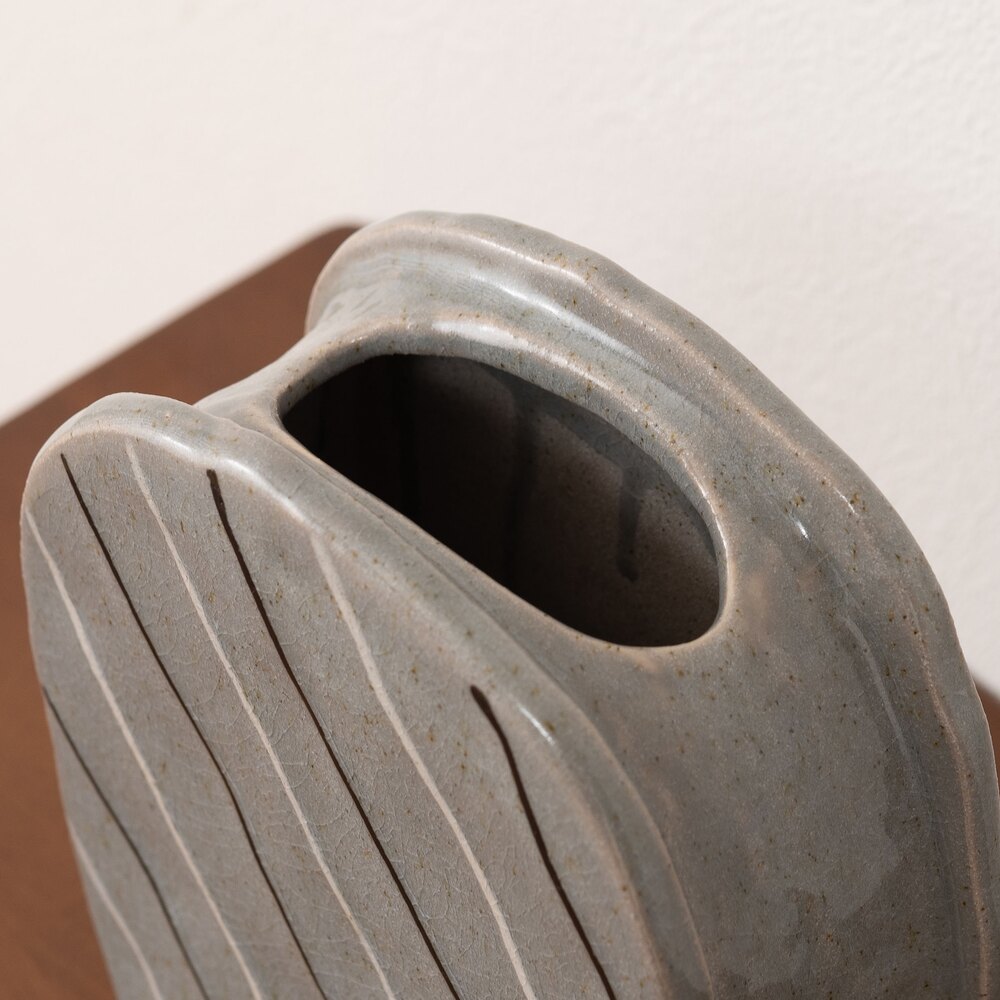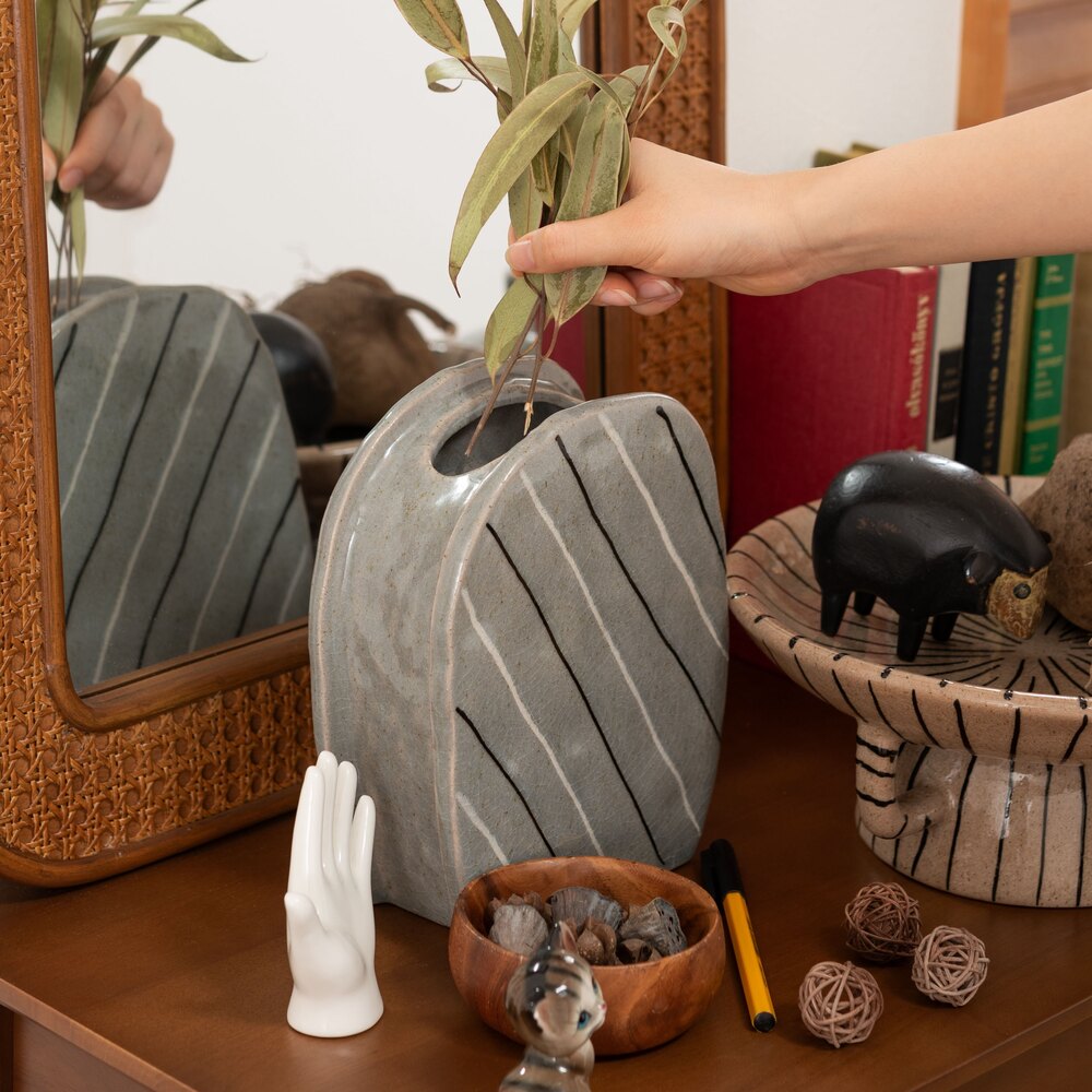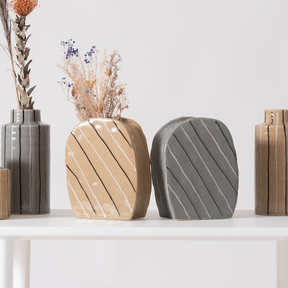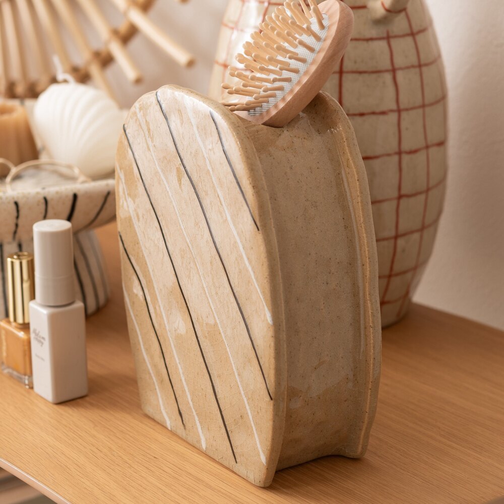 平たいユニークなフォルムには、手書きのような温かみのあるストライプをあしらいました。