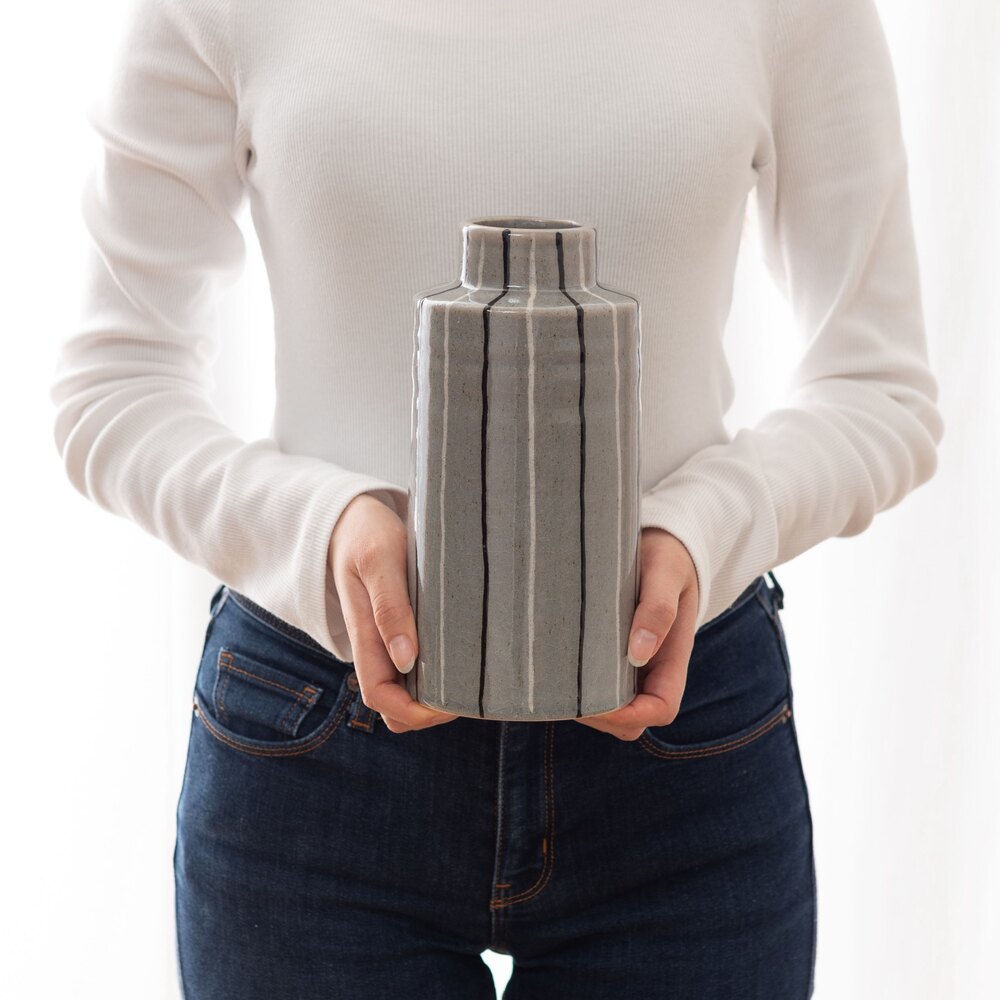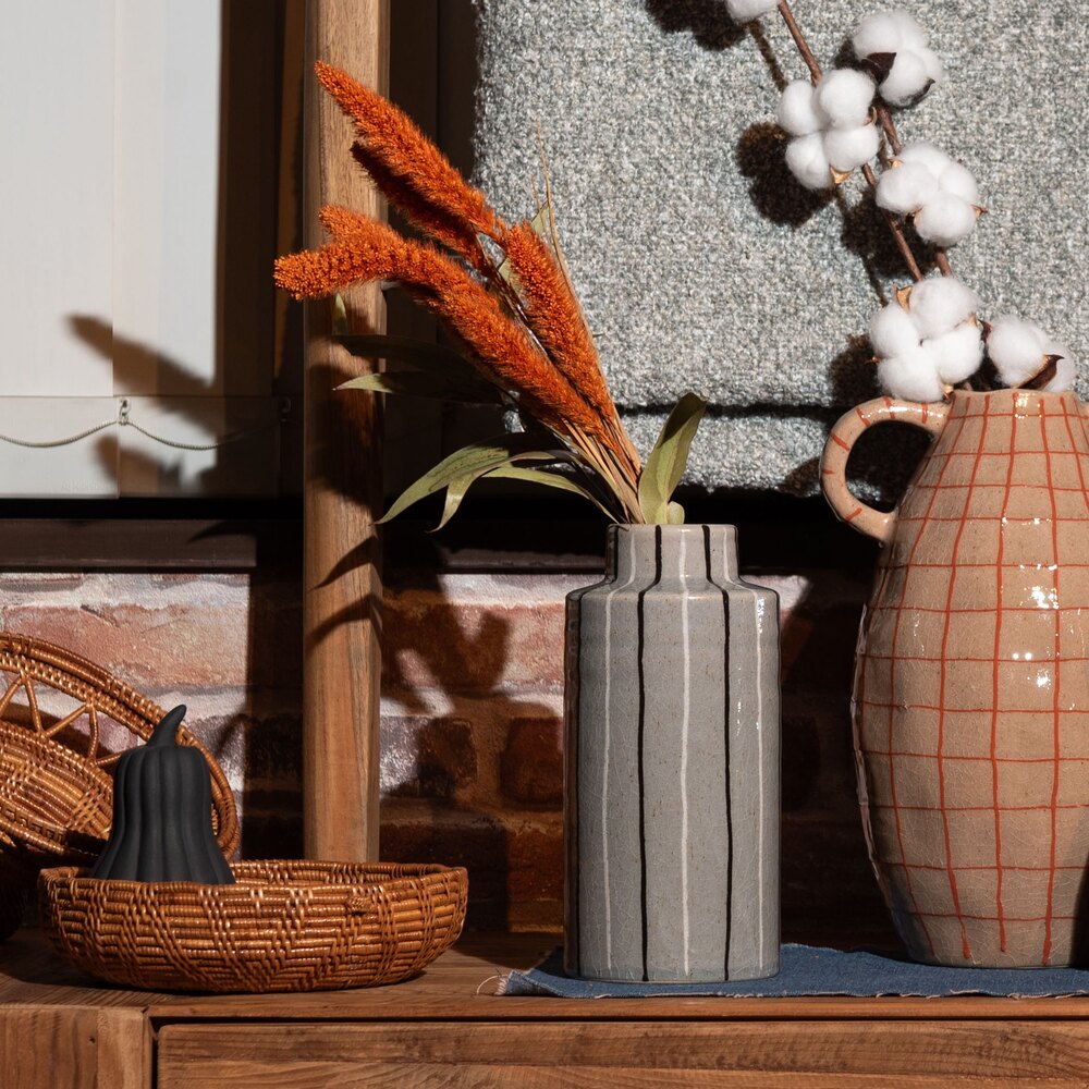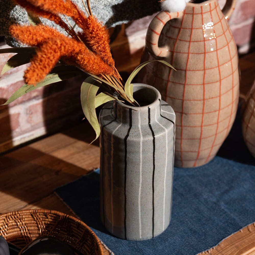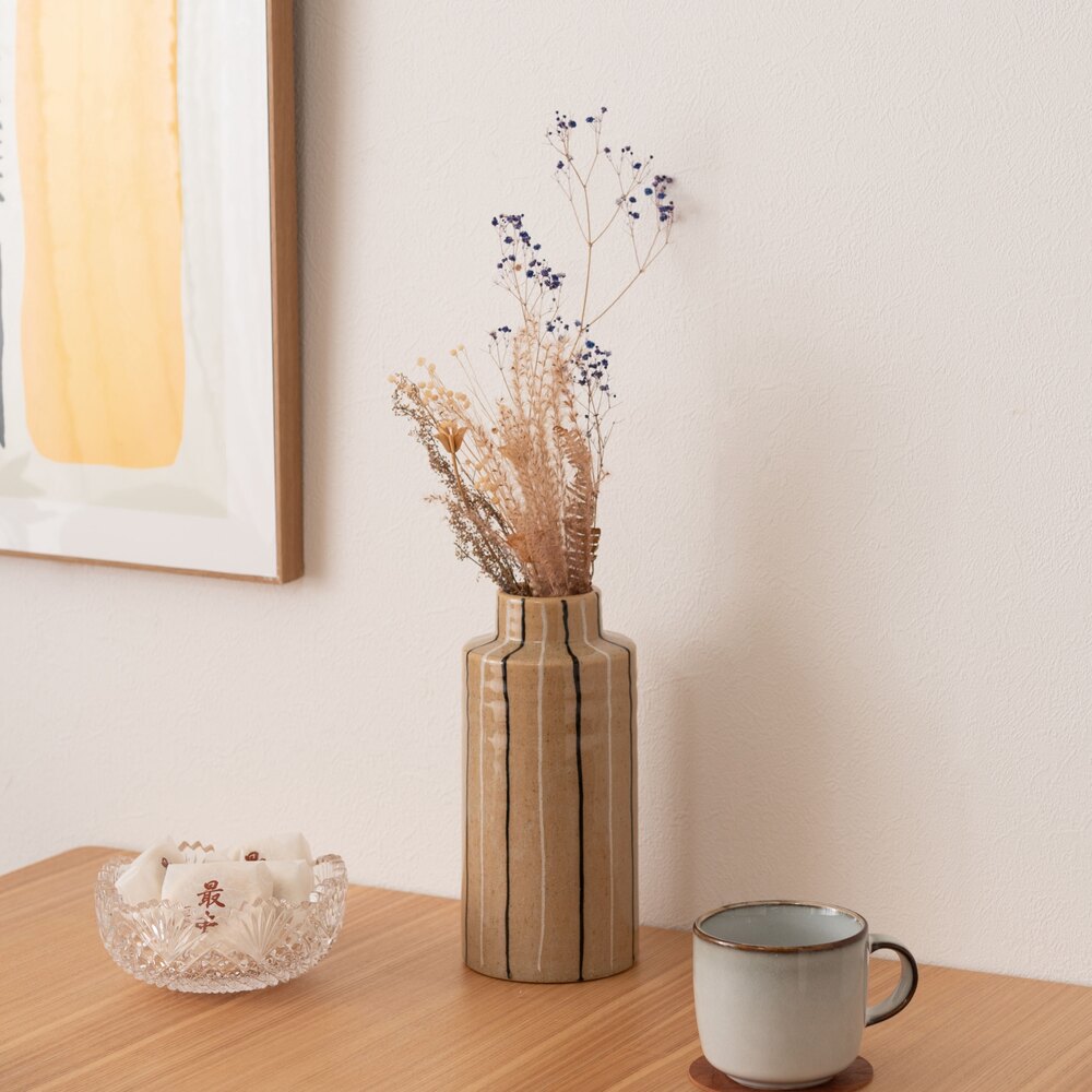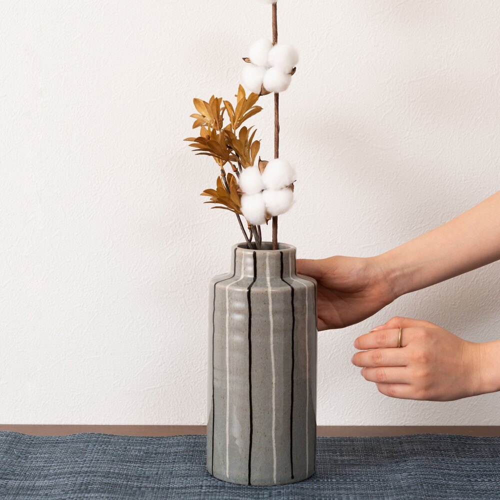 手書きのような温かみのあるストライプが、空間に優しいリズムを生み出すフラワーベースです。