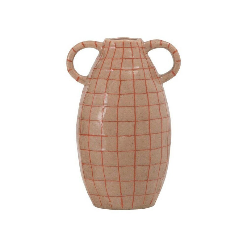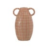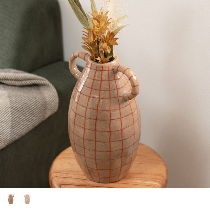 手書きのチェック柄と、ころんとした壺のようなフォルムが愛らしいフラワーベース。