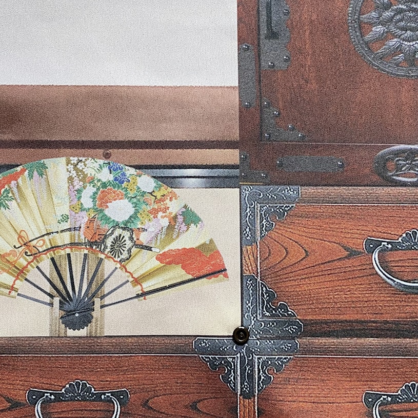 一段短くすると、棚が一段なくなる遊び心溢れるデザイン。 短くするたびに見えるデザインが変わるおもしろい和のれん。