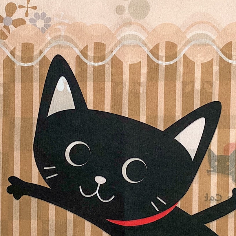 表面は可愛い猫達がお出迎えしてくれる、ねこの世界への入り口の様なデザイン。裏表で違うデザインがニャンとも面白いダブルプリントのれん。