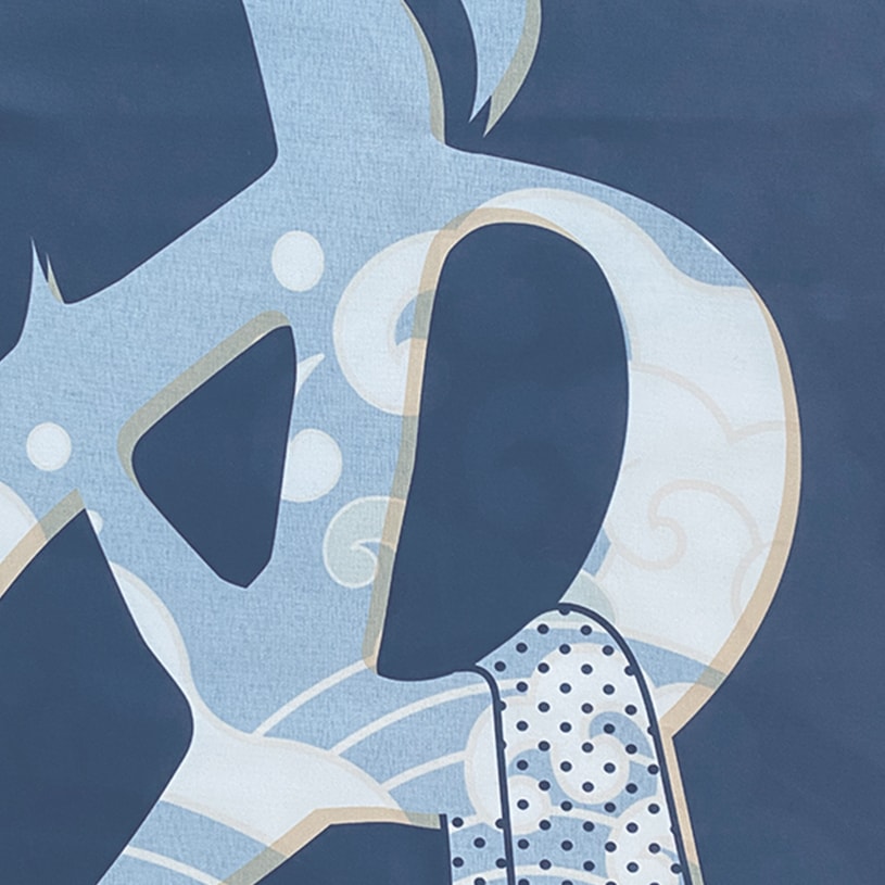 まるで下町の銭湯への入り口の様なほっとするデザイン。両面にプリントは施され、色や形の掛け合いが透けて見えることにより、違うデザインに見える粋な仕掛けが♪