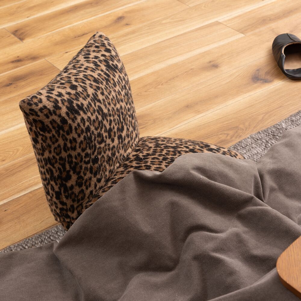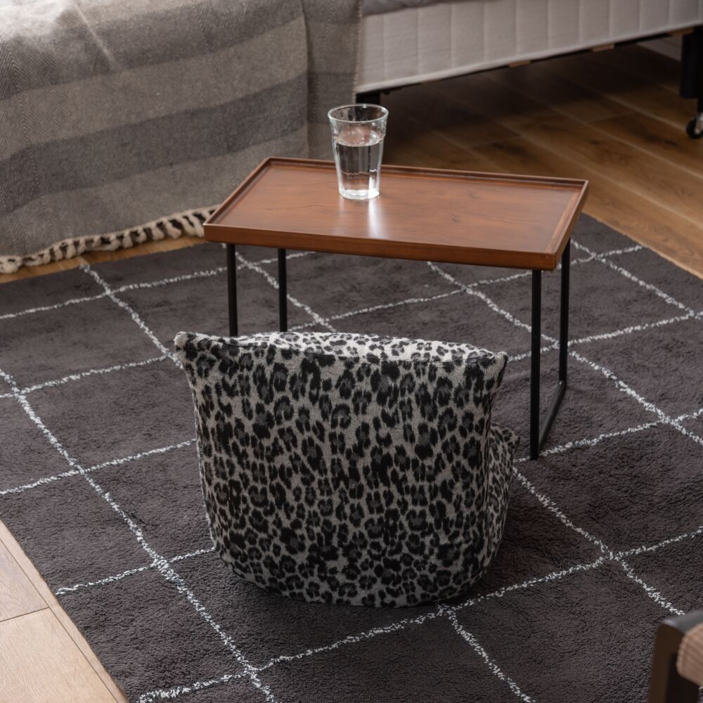 お部屋にアクセントを効かせる、愛らしいレオパード柄のコンパクトなフロアチェア。