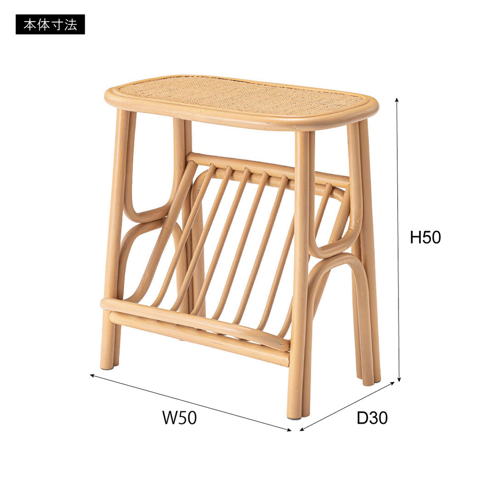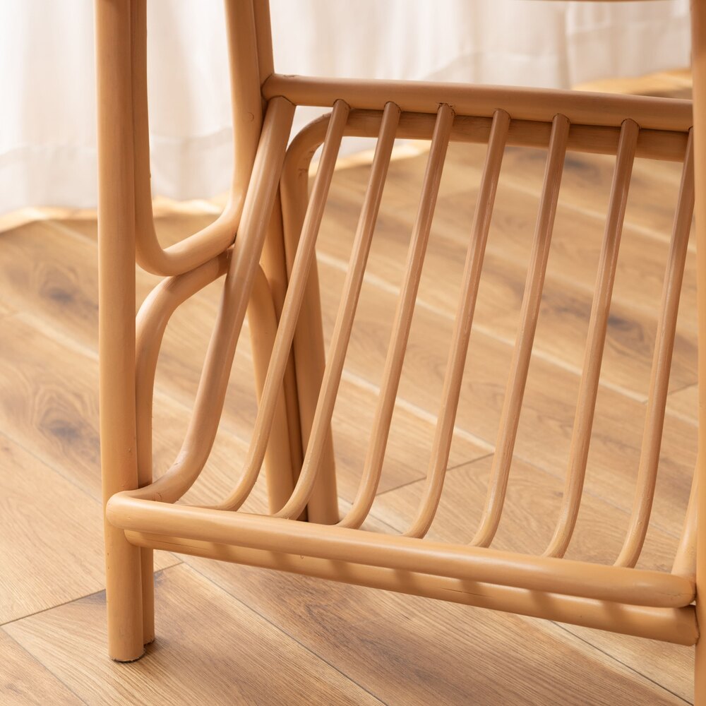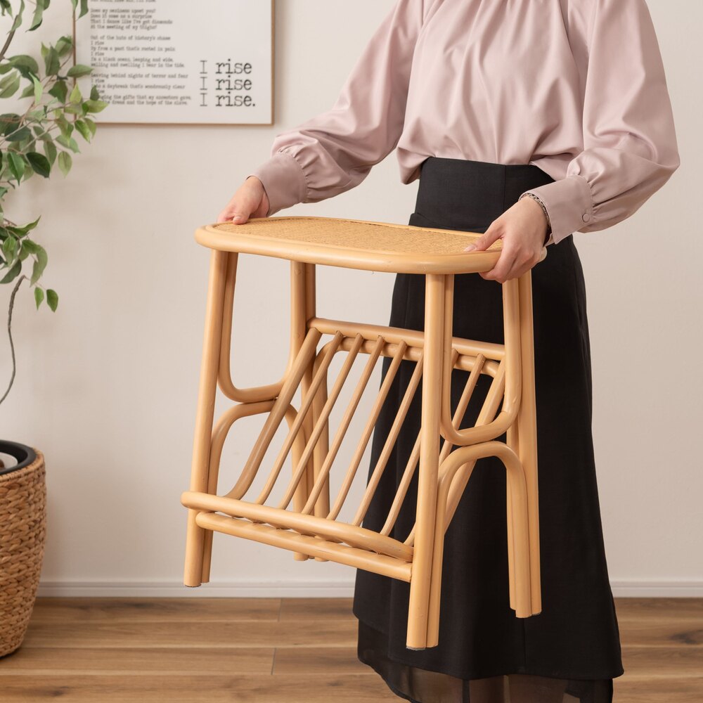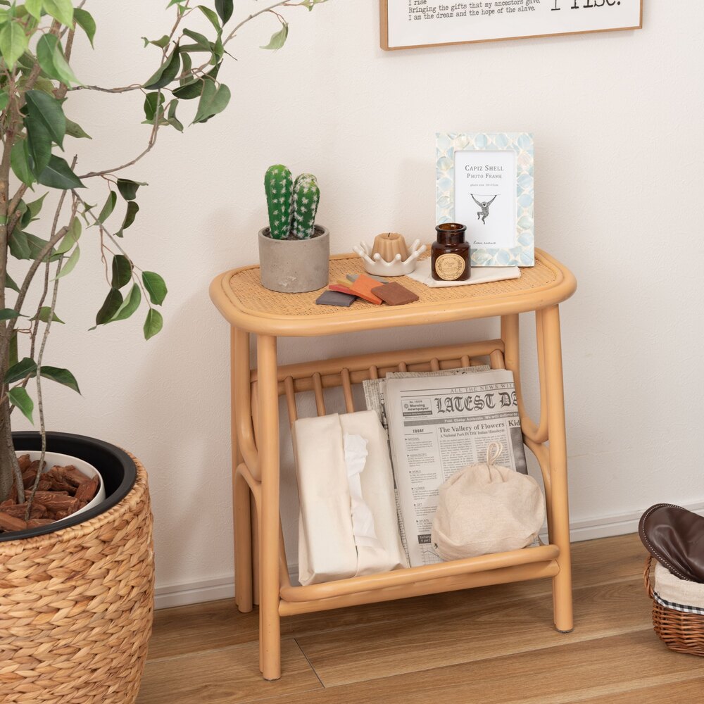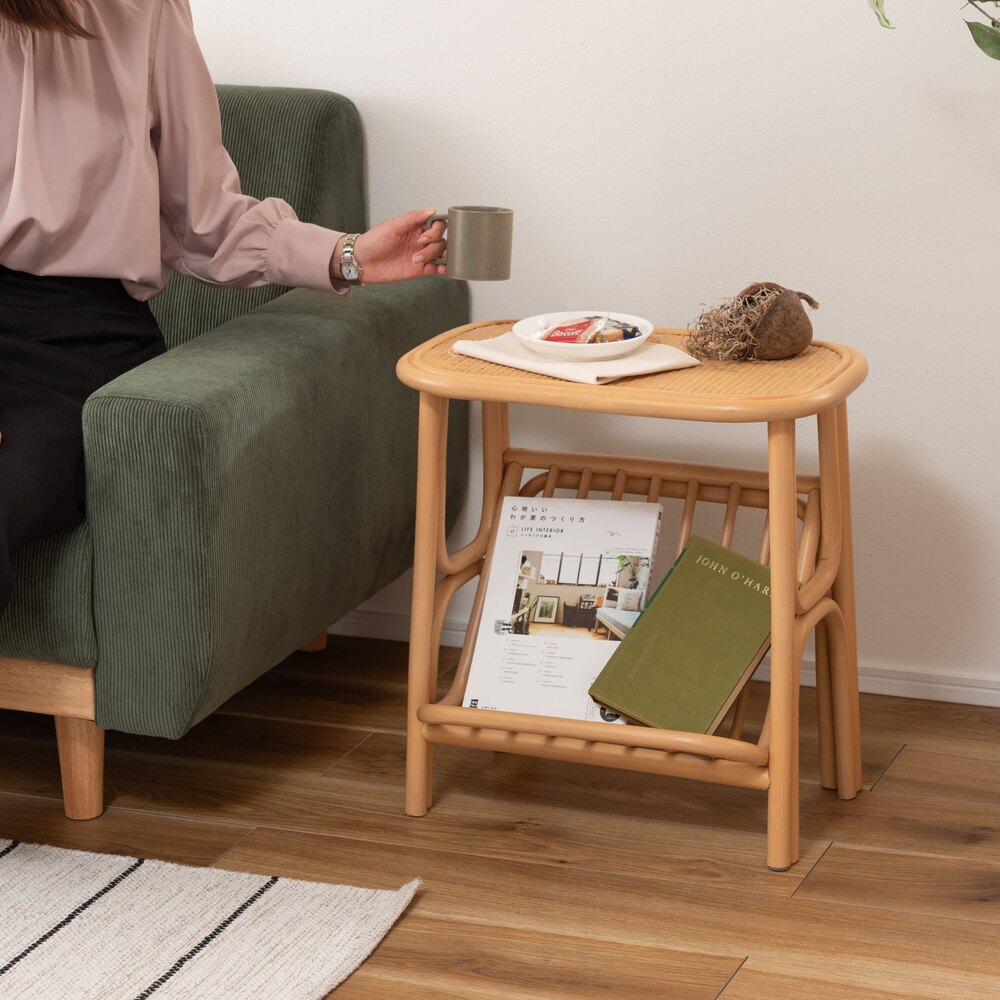 天然ラタンの優しい風合いが目を引くマガジンラック付きサイドテーブル。