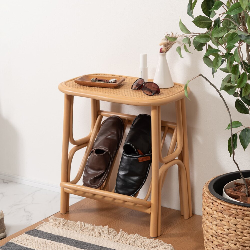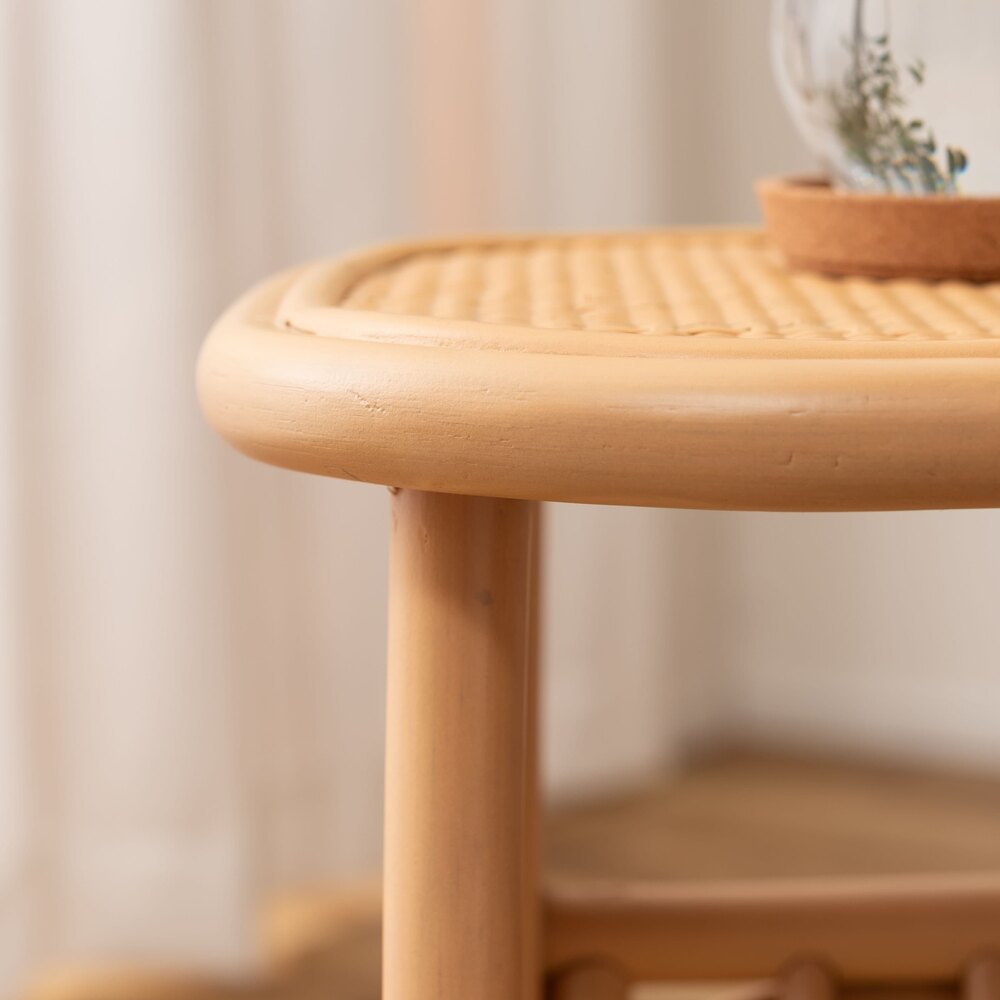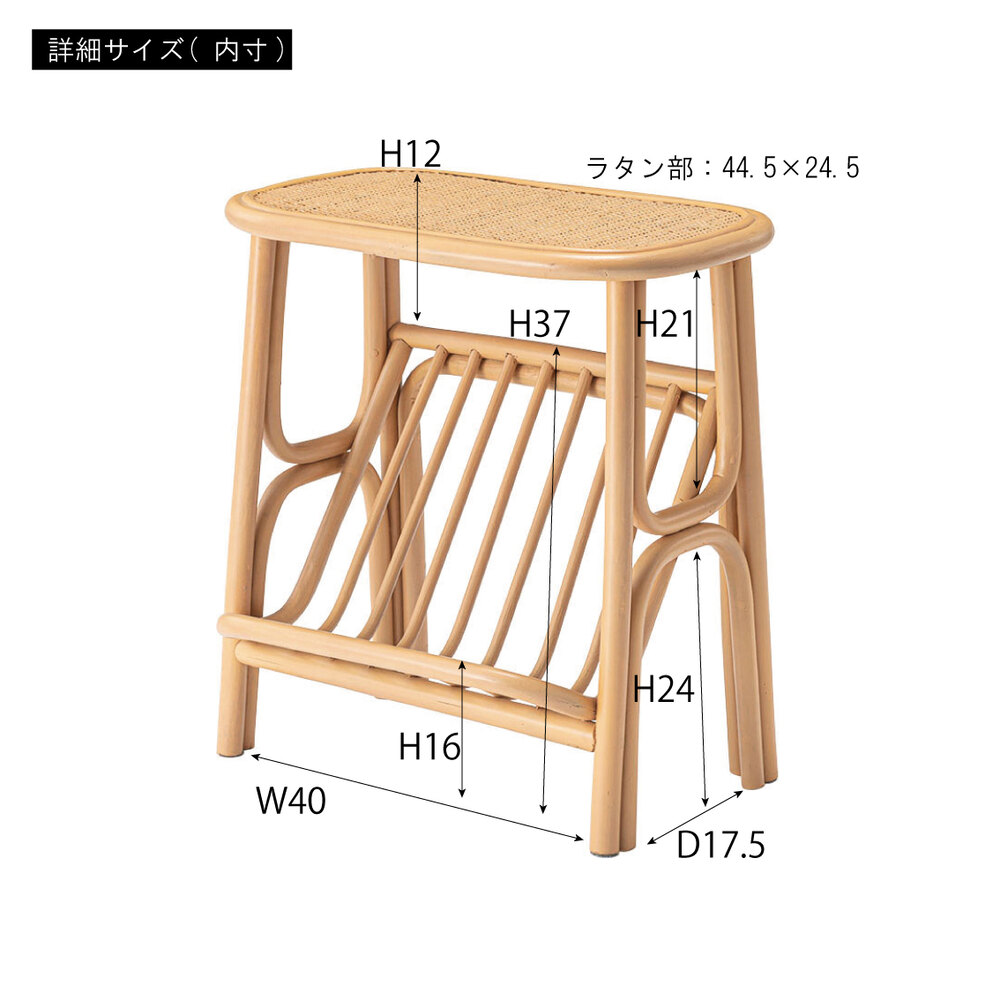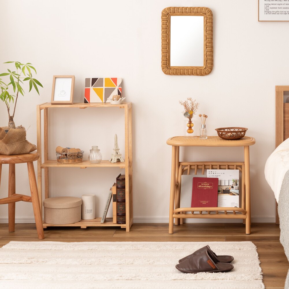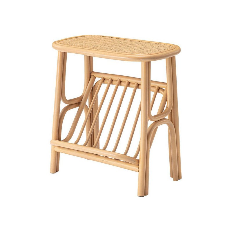天然ラタンの優しい風合いが目を引くマガジンラック付きサイドテーブル。