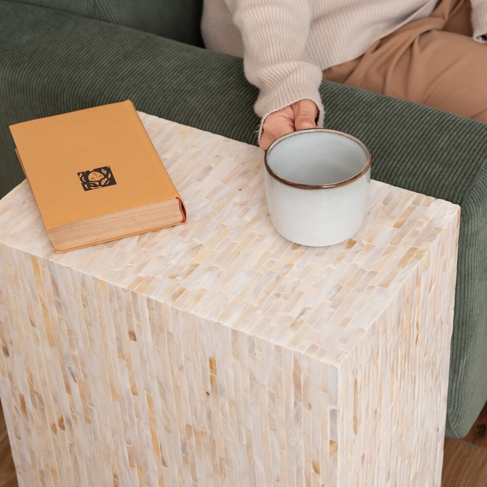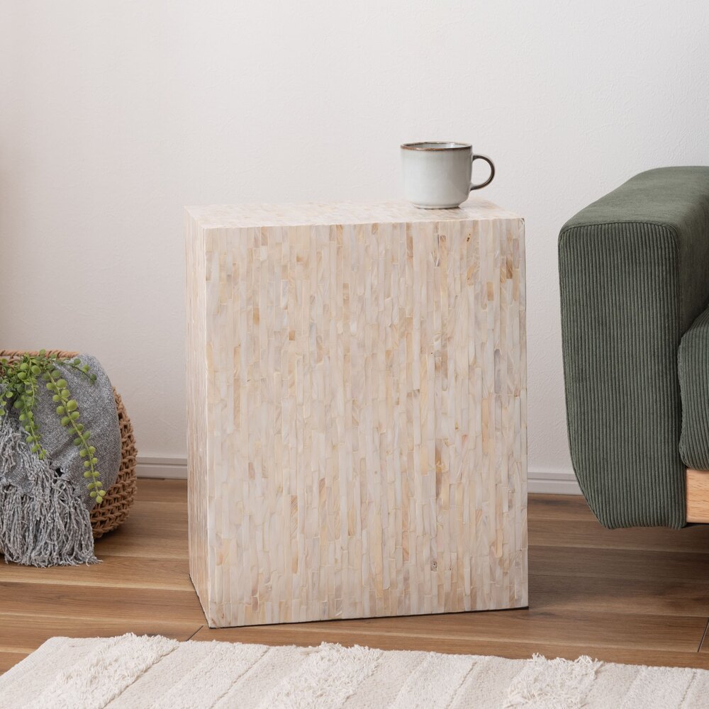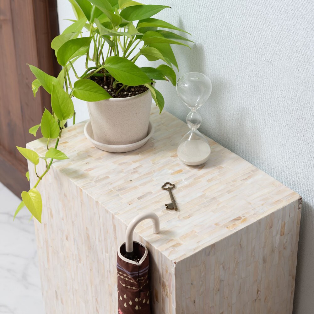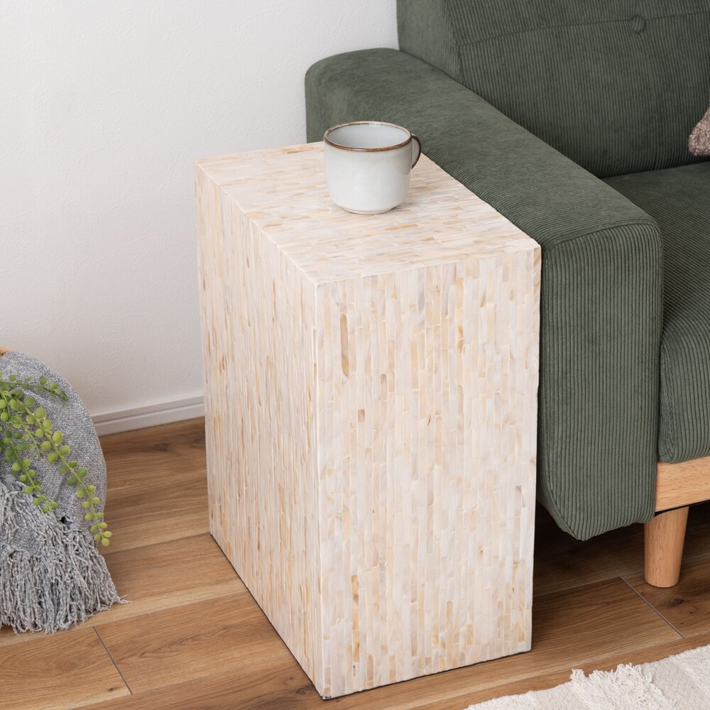 真珠のような美しい光沢が魅力のマザーオブパールを全面にあしらったサイドテーブル。