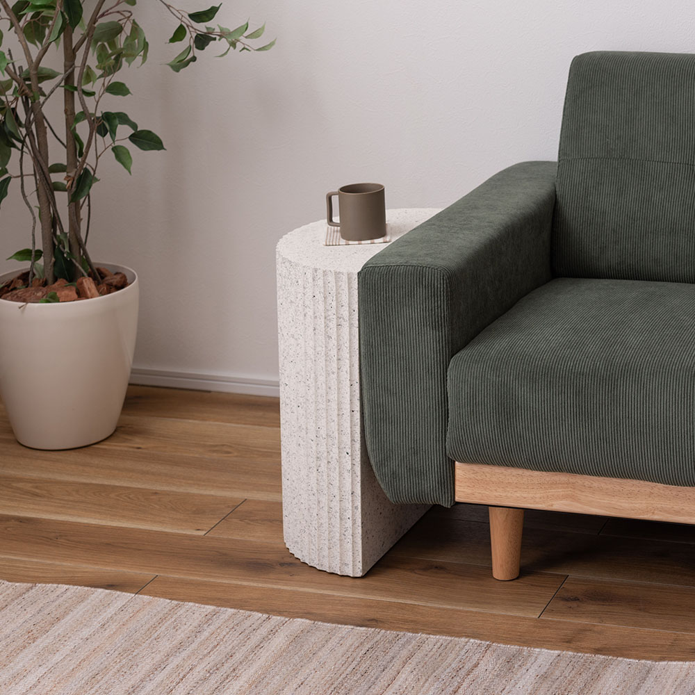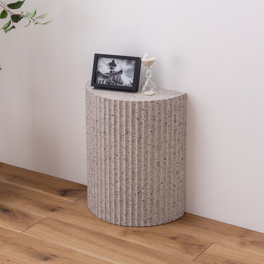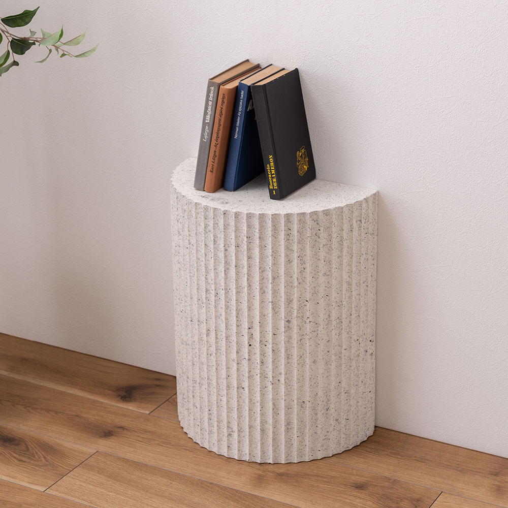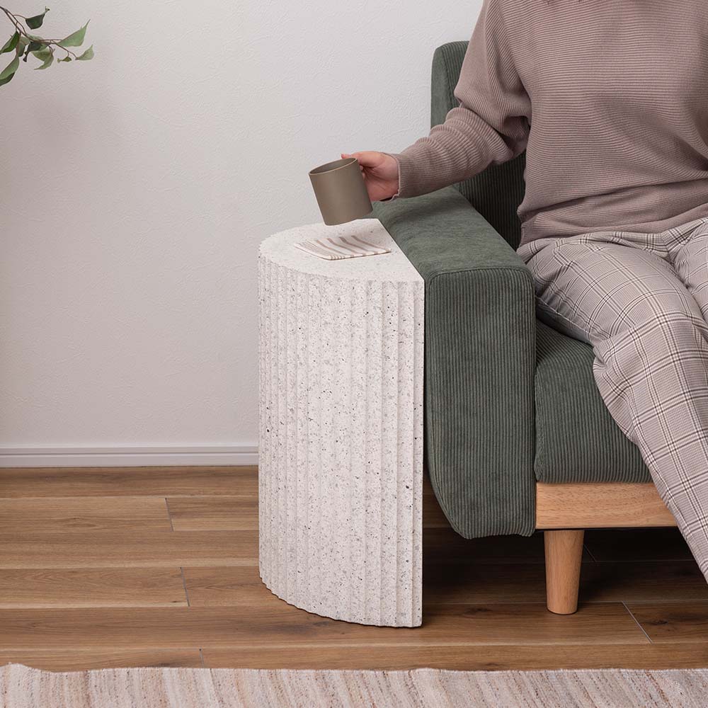 壁際やソファの横に、すっきりと収まる半円形のサイドテーブル。