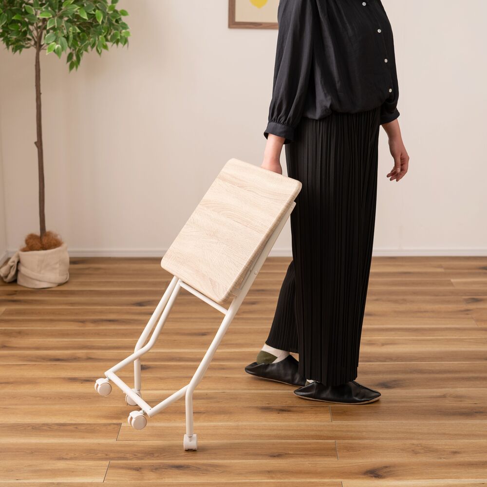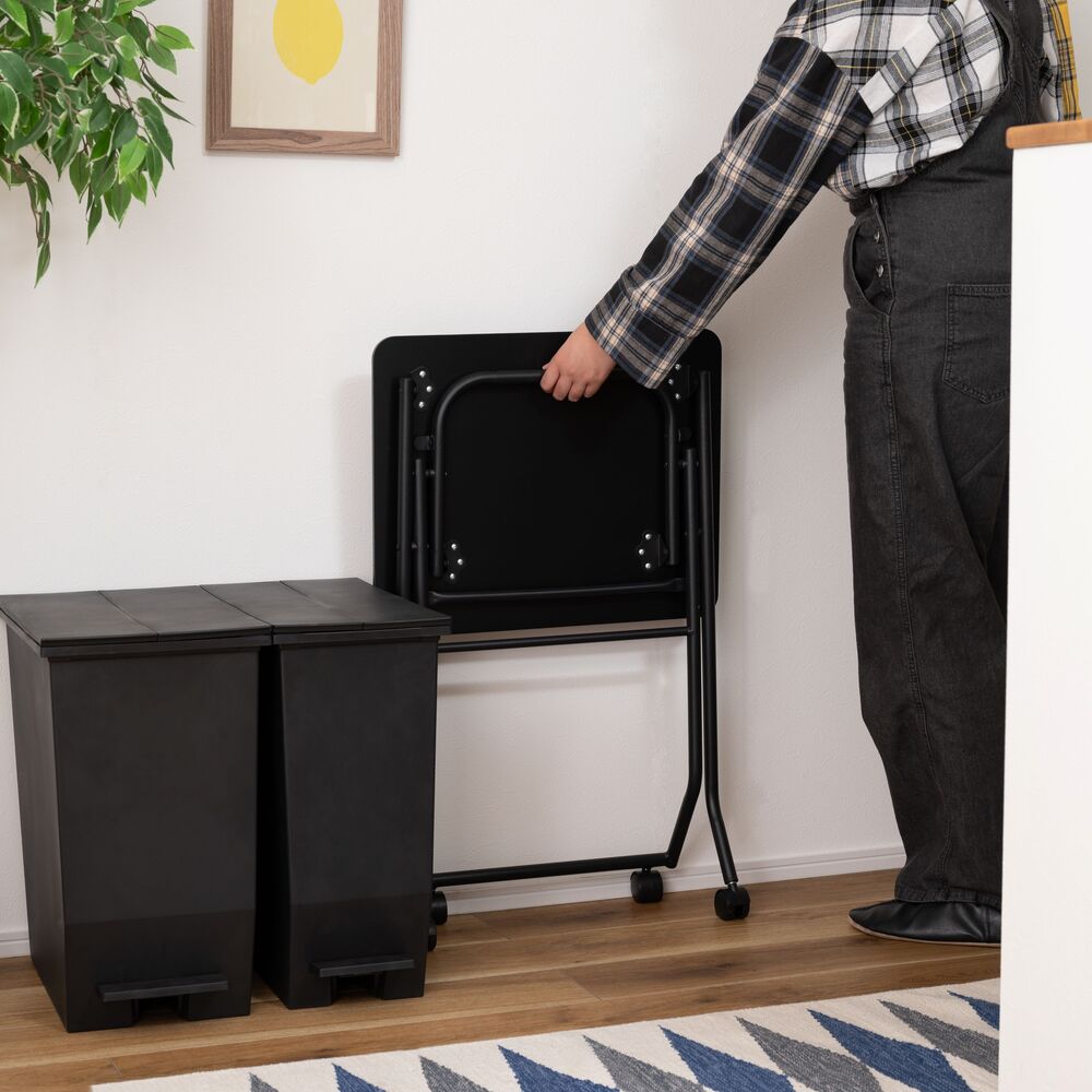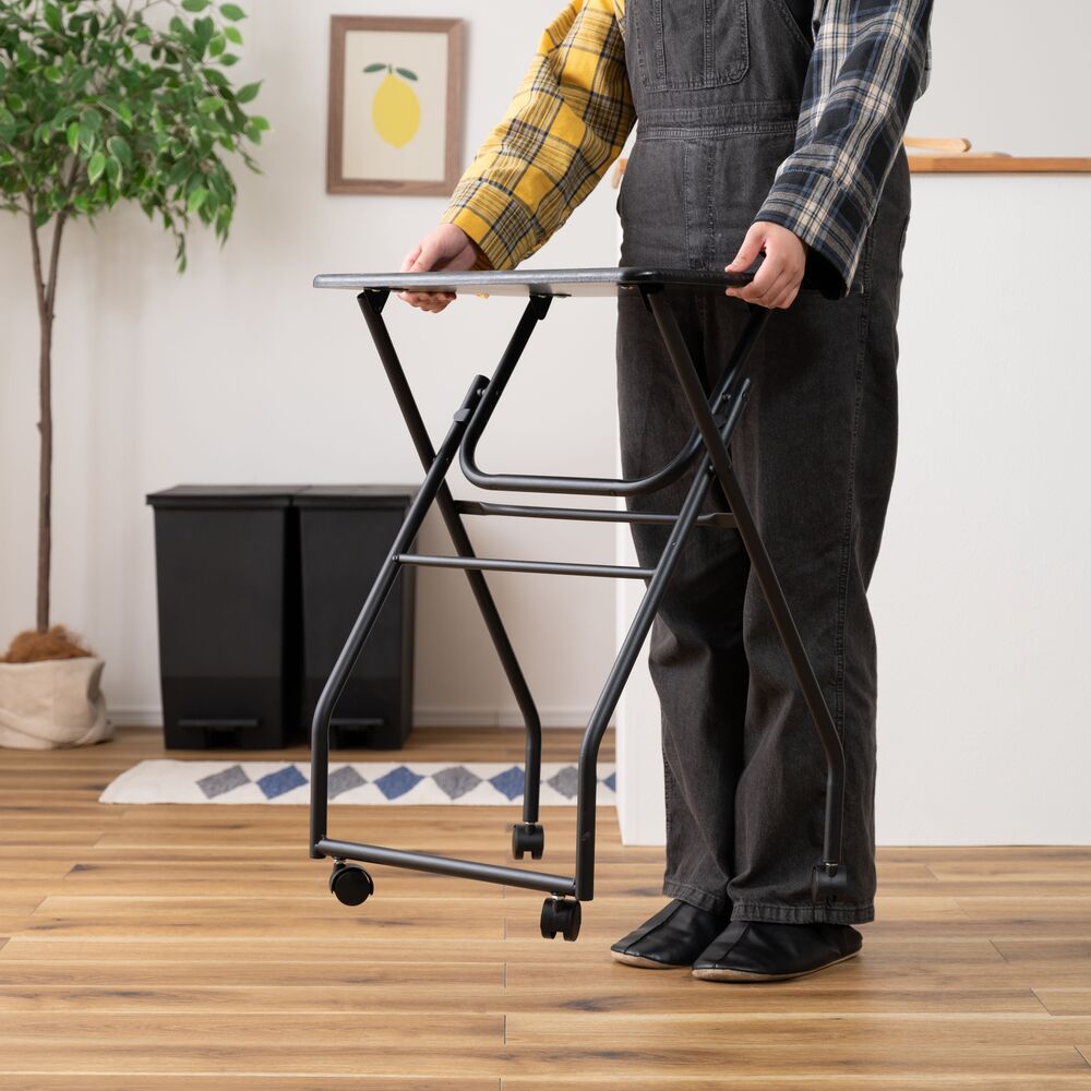 キャスター付きで移動はスムーズ。使わない時はパタンと折りたたんで、そのまま立てておけるので収納場所にも困りません。