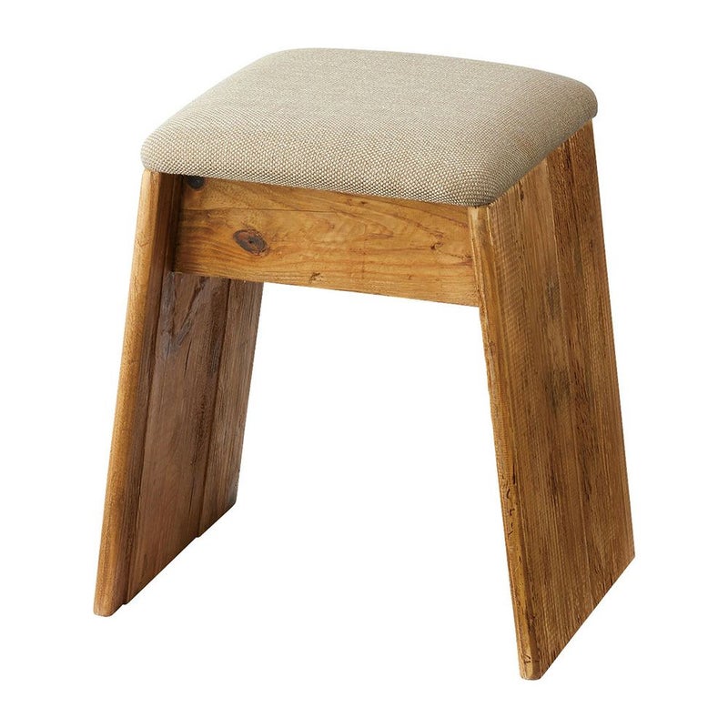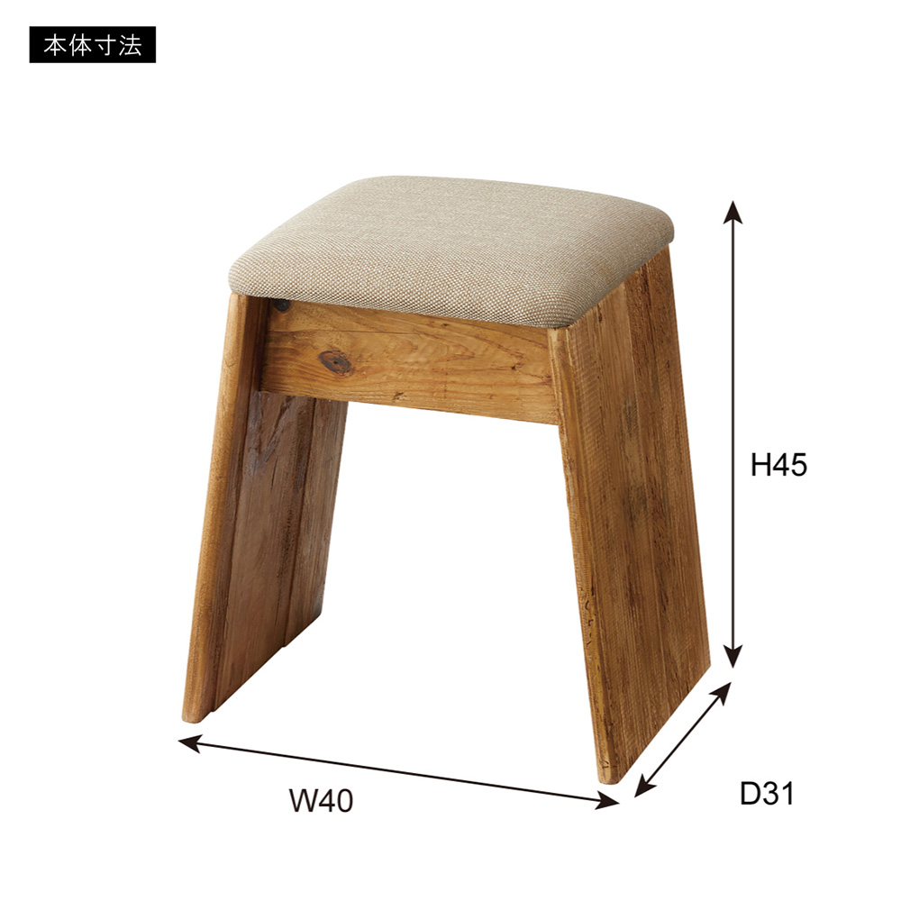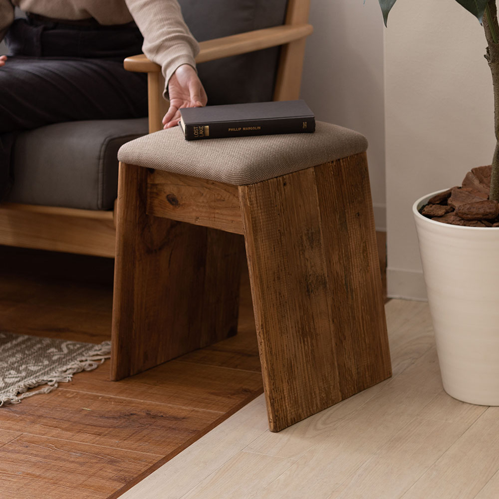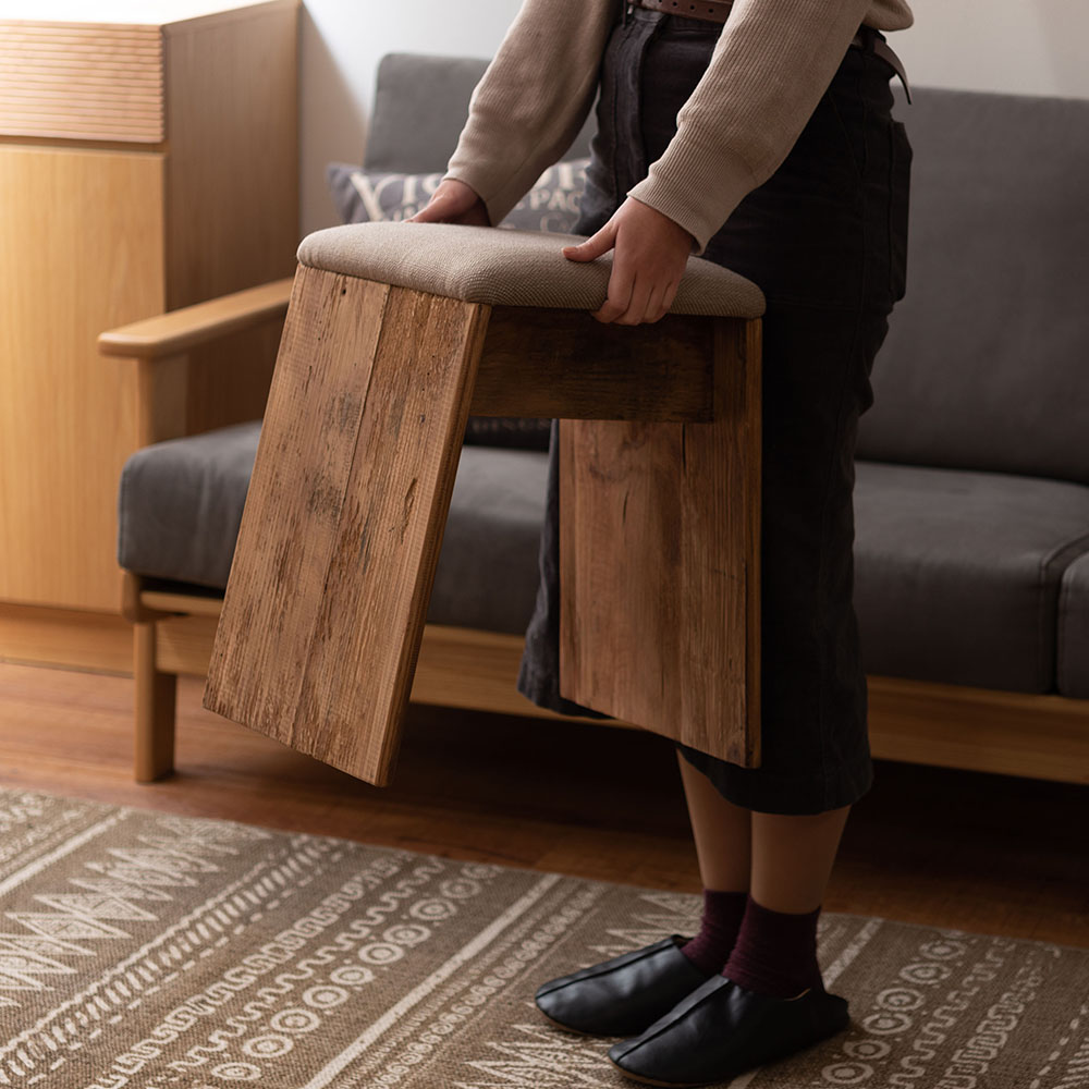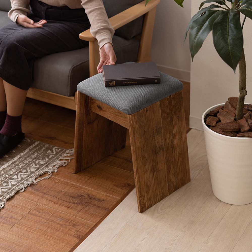 ひとつひとつ表情の異なるパイン古材を使用し、ファブリックと組み合わせたナチュラルで上質なスツールです。