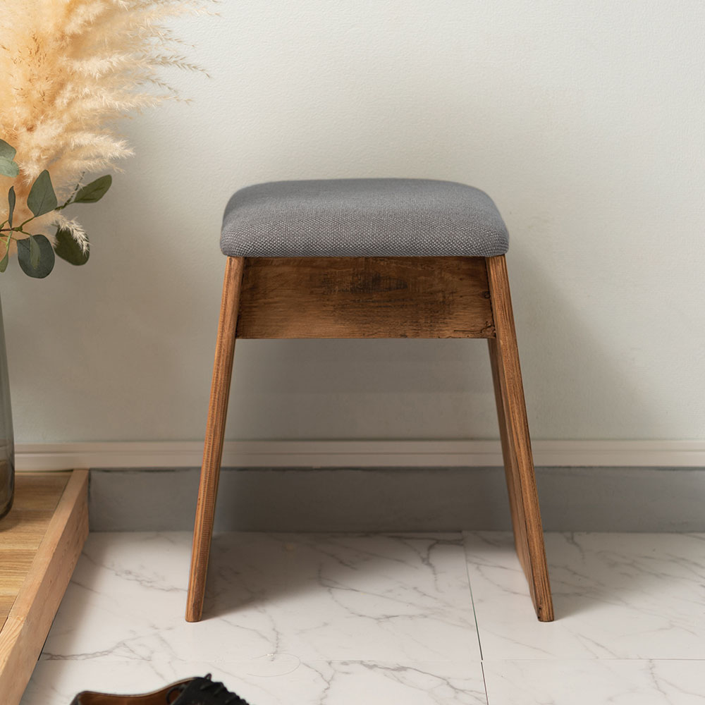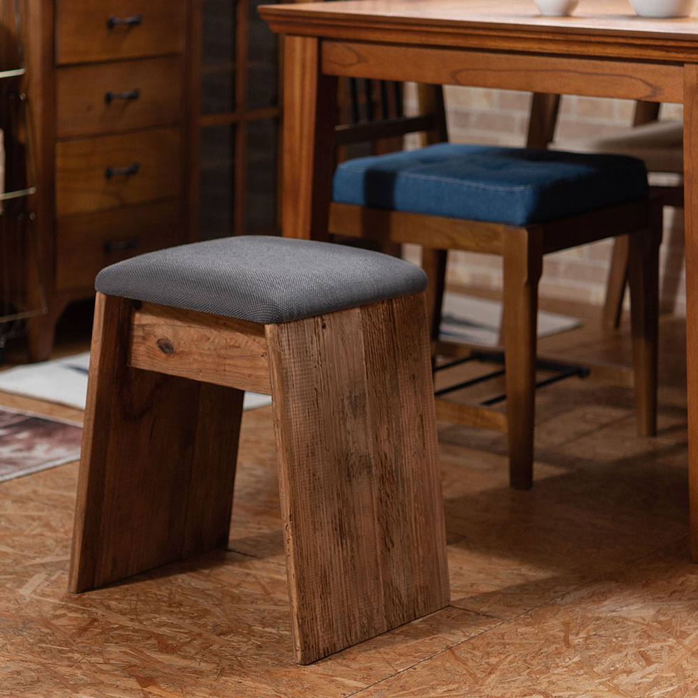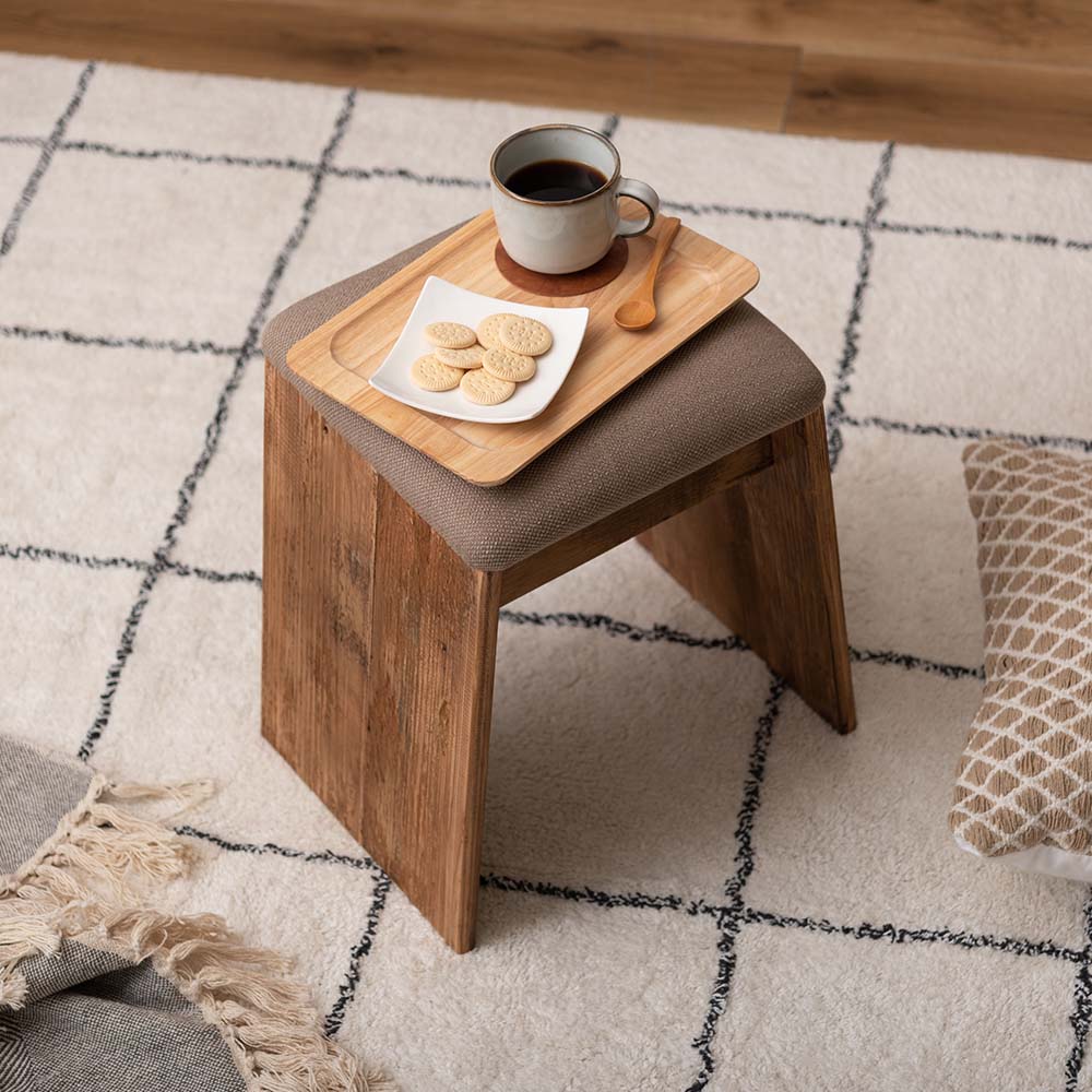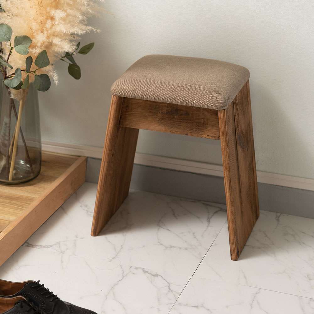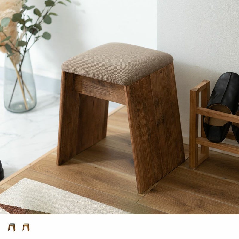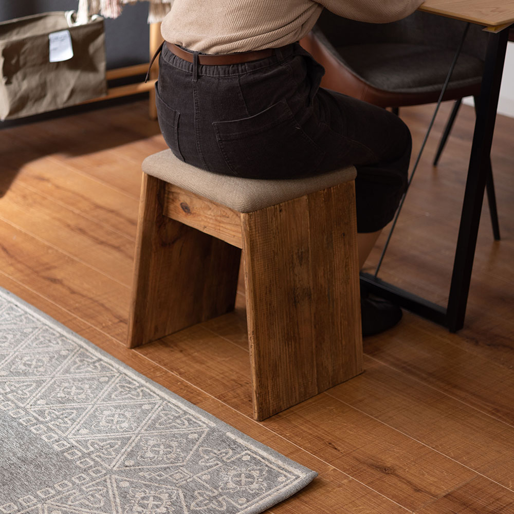 ひとつひとつ表情の異なるパイン古材を使用し、ファブリックと組み合わせたナチュラルで上質なスツールです。