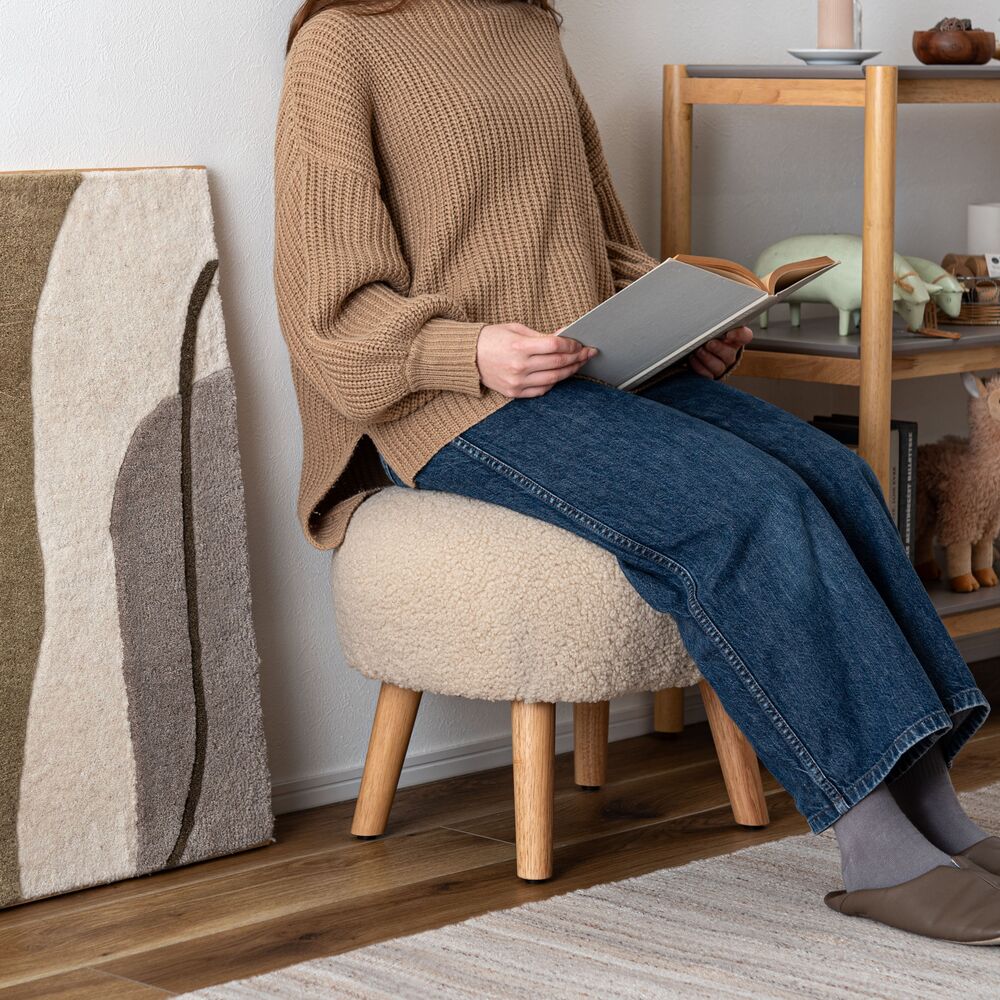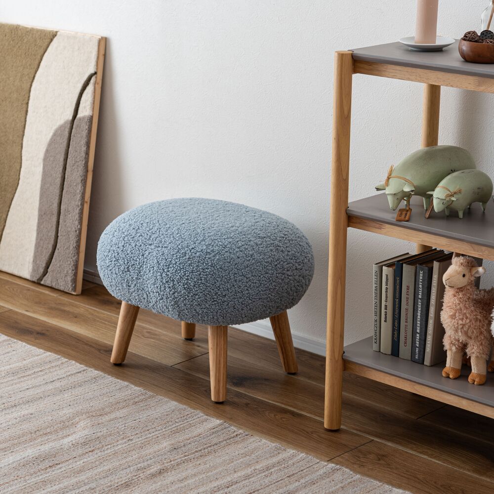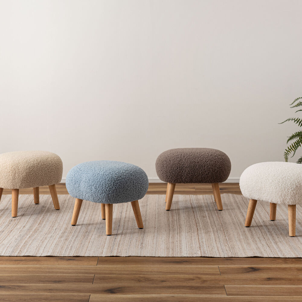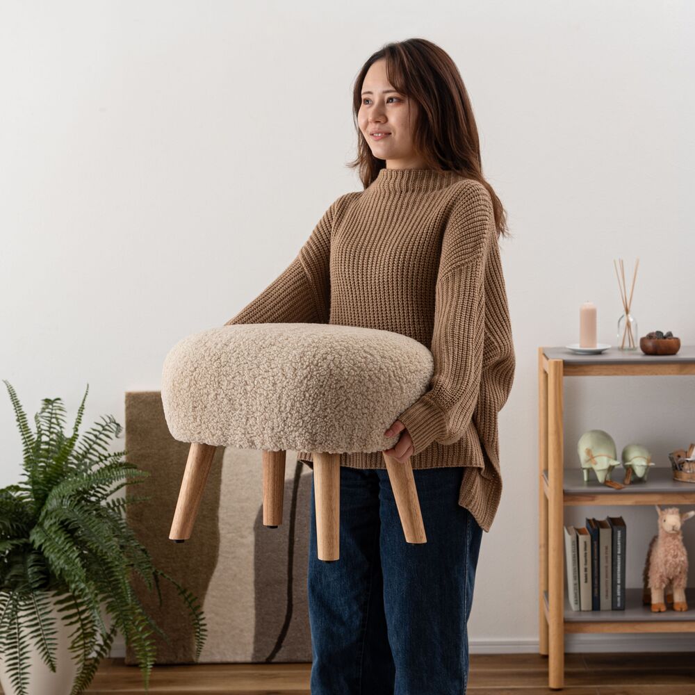 ころんとした丸いフォルムと、もこもこのブークレ生地が愛らしいスツール。