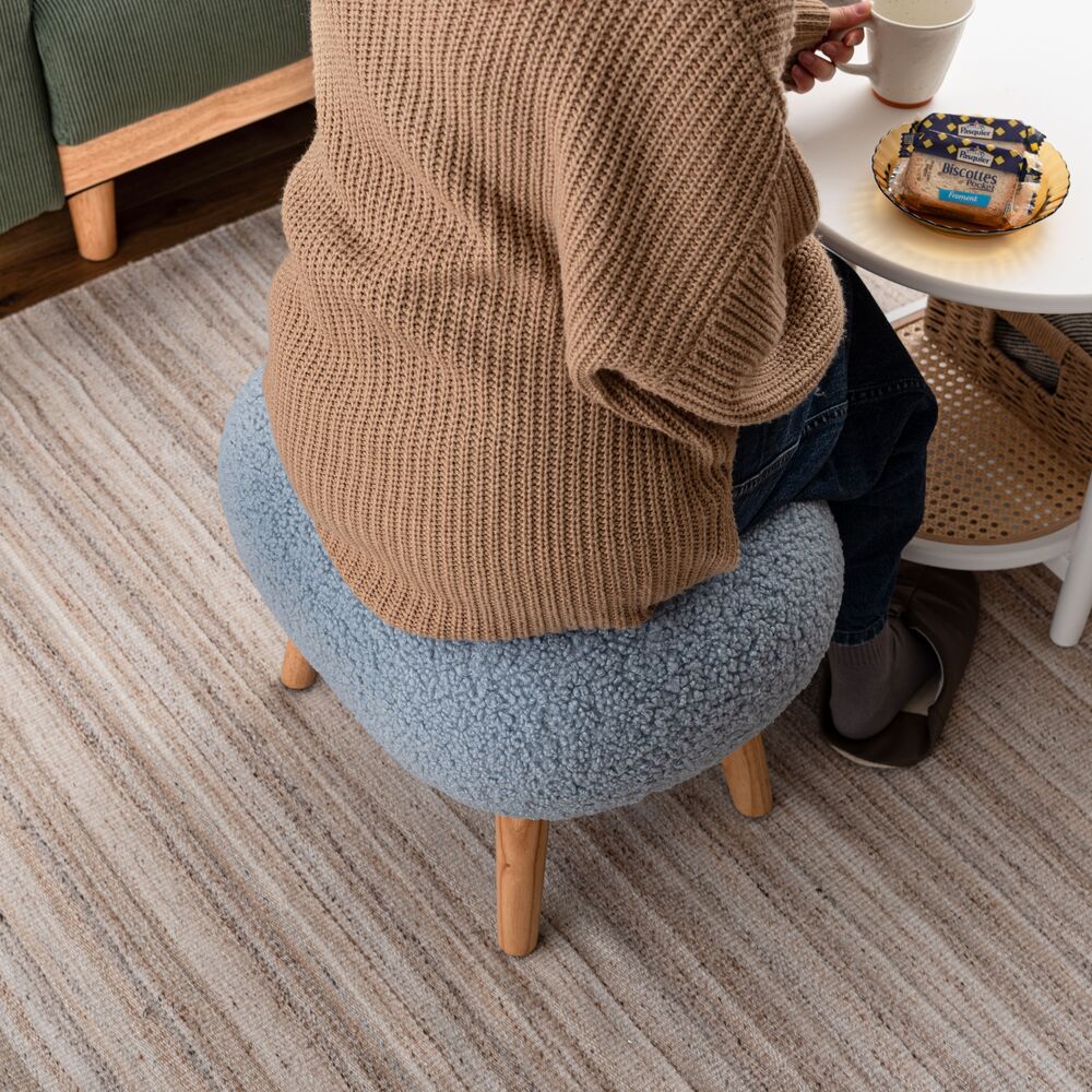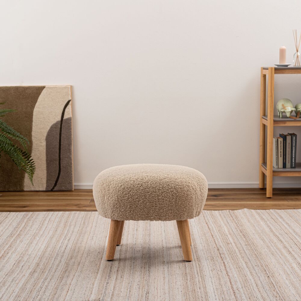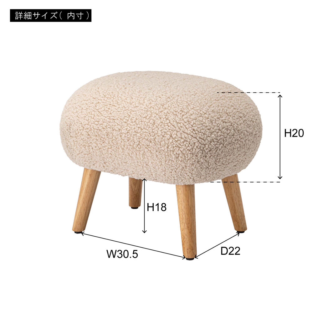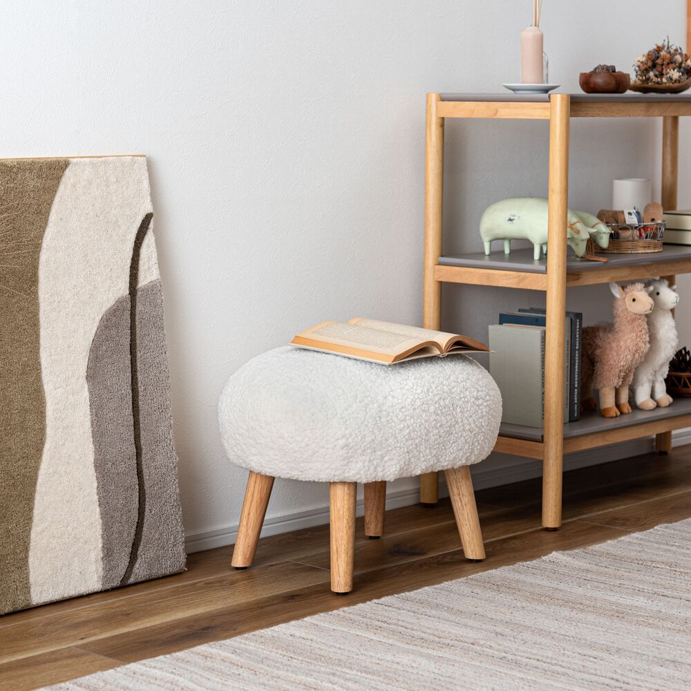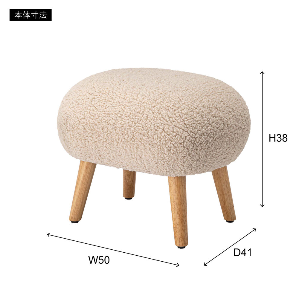 ころんとした丸いフォルムと、もこもこのブークレ生地が愛らしいスツール。