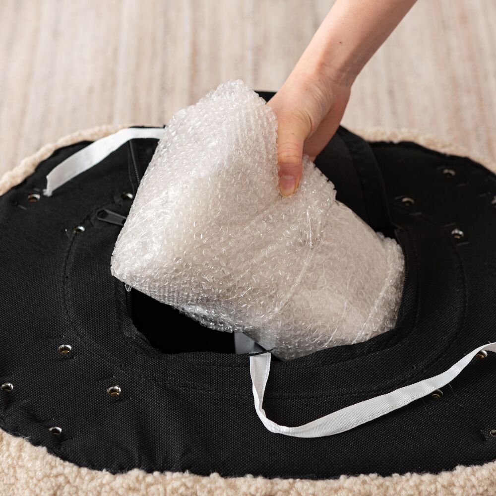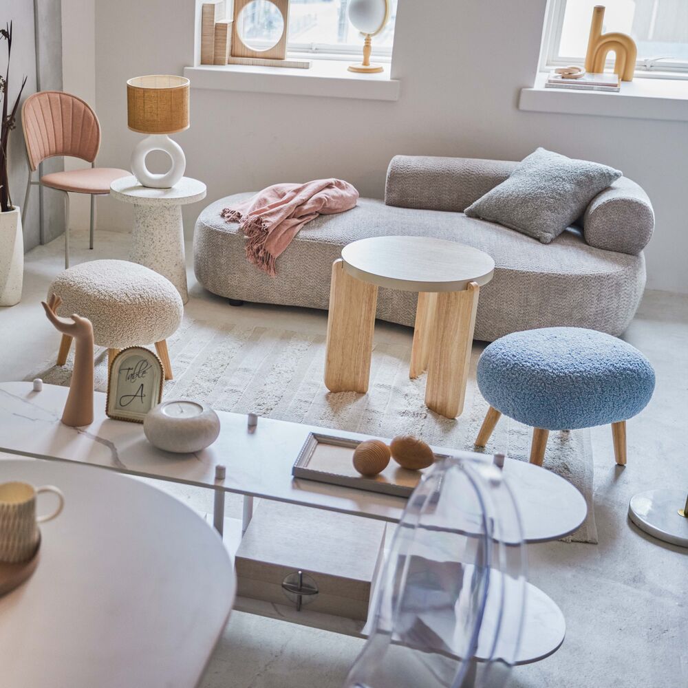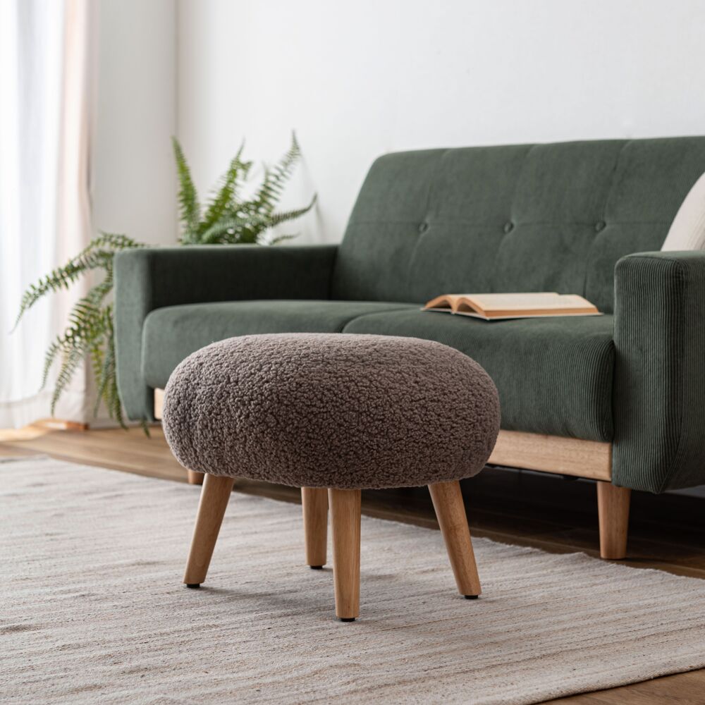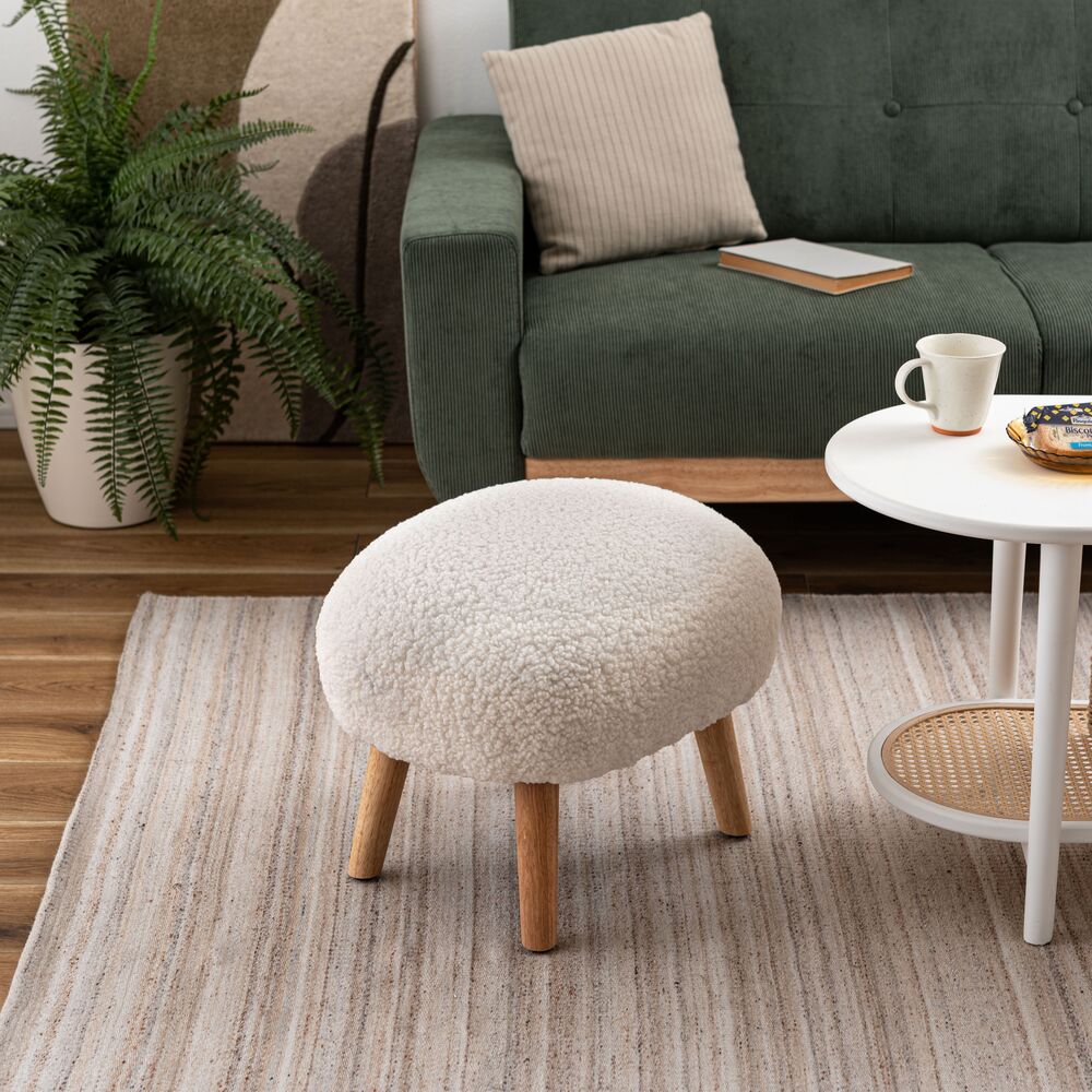 ころんとした丸いフォルムと、もこもこのブークレ生地が愛らしいスツール。