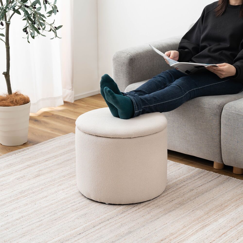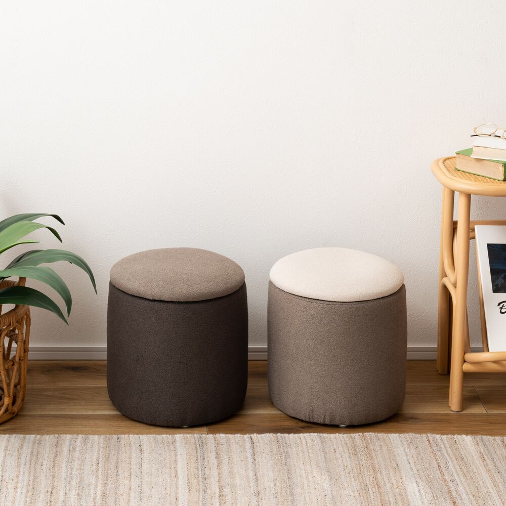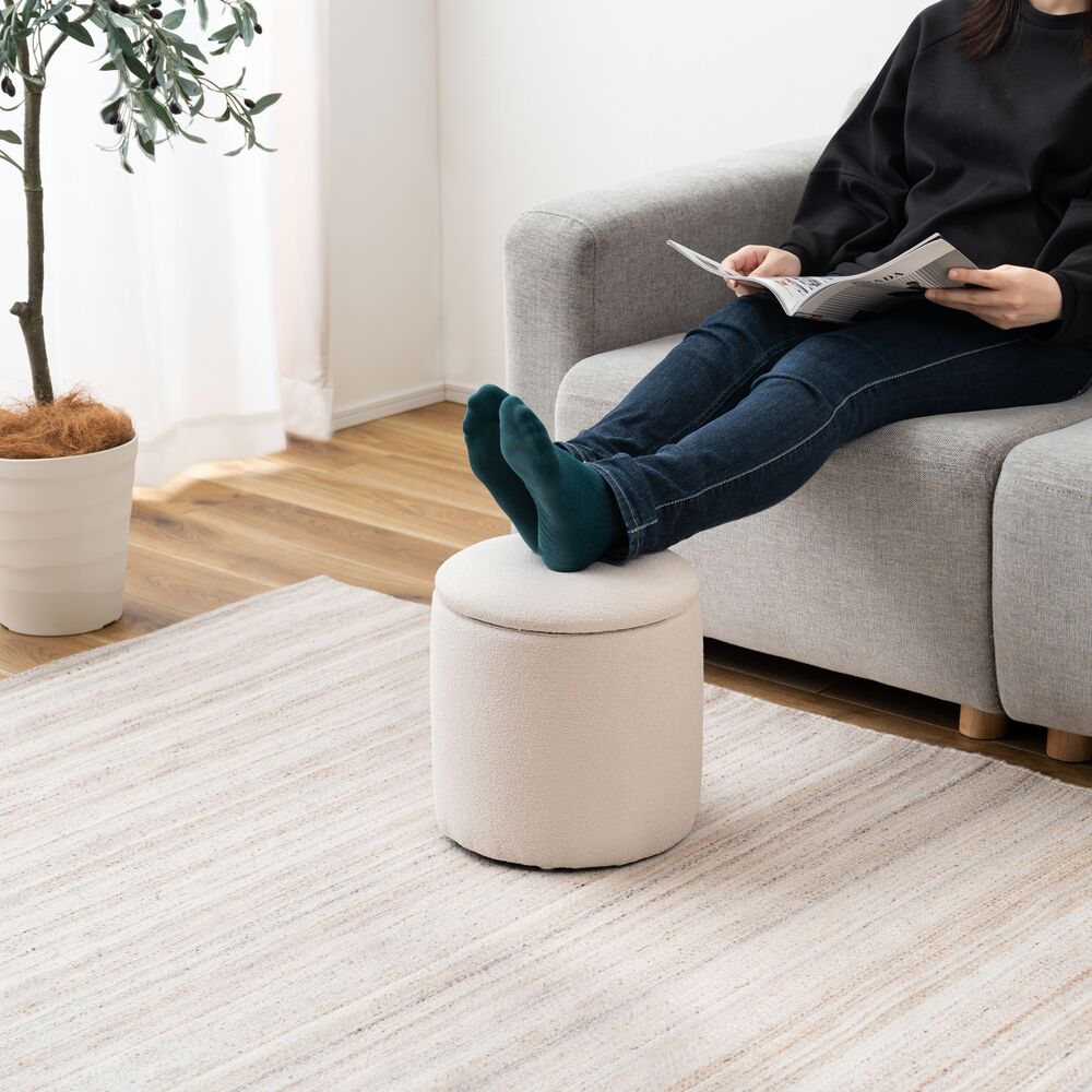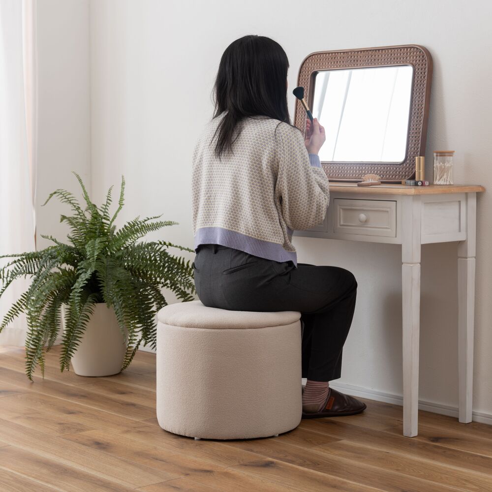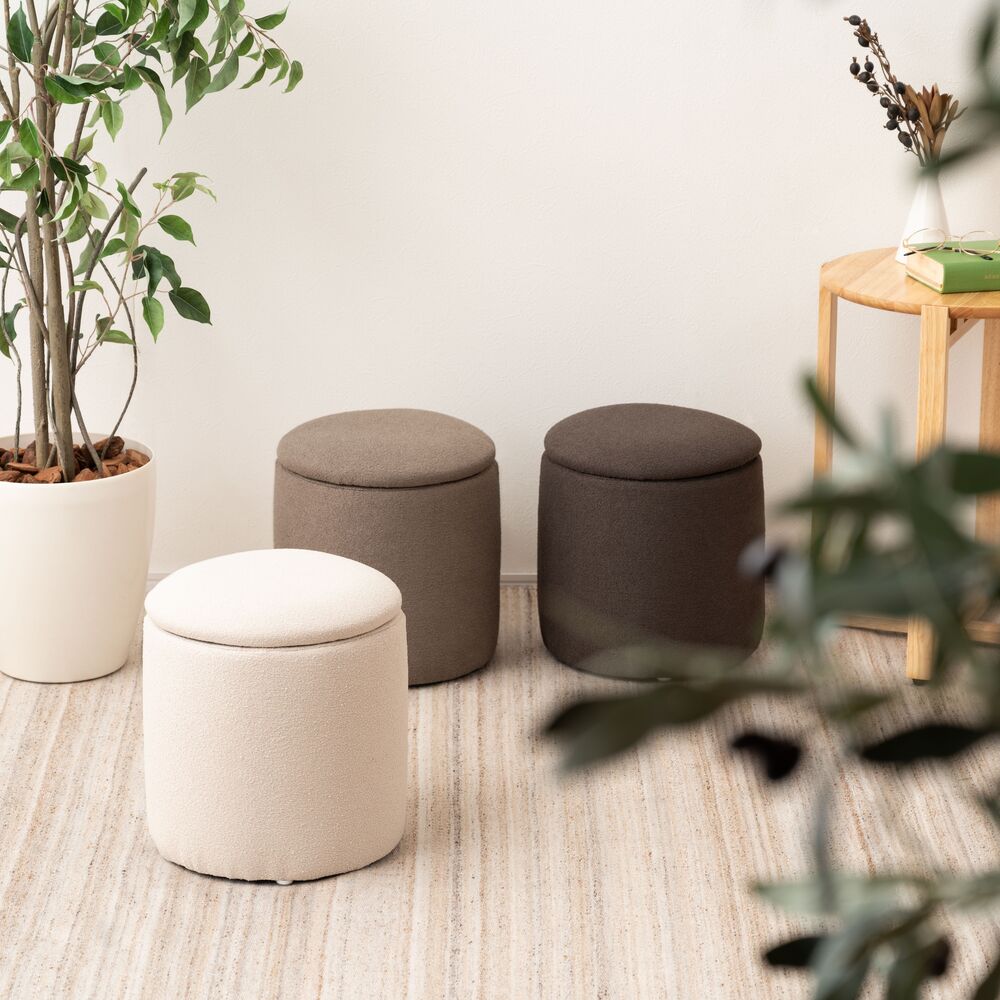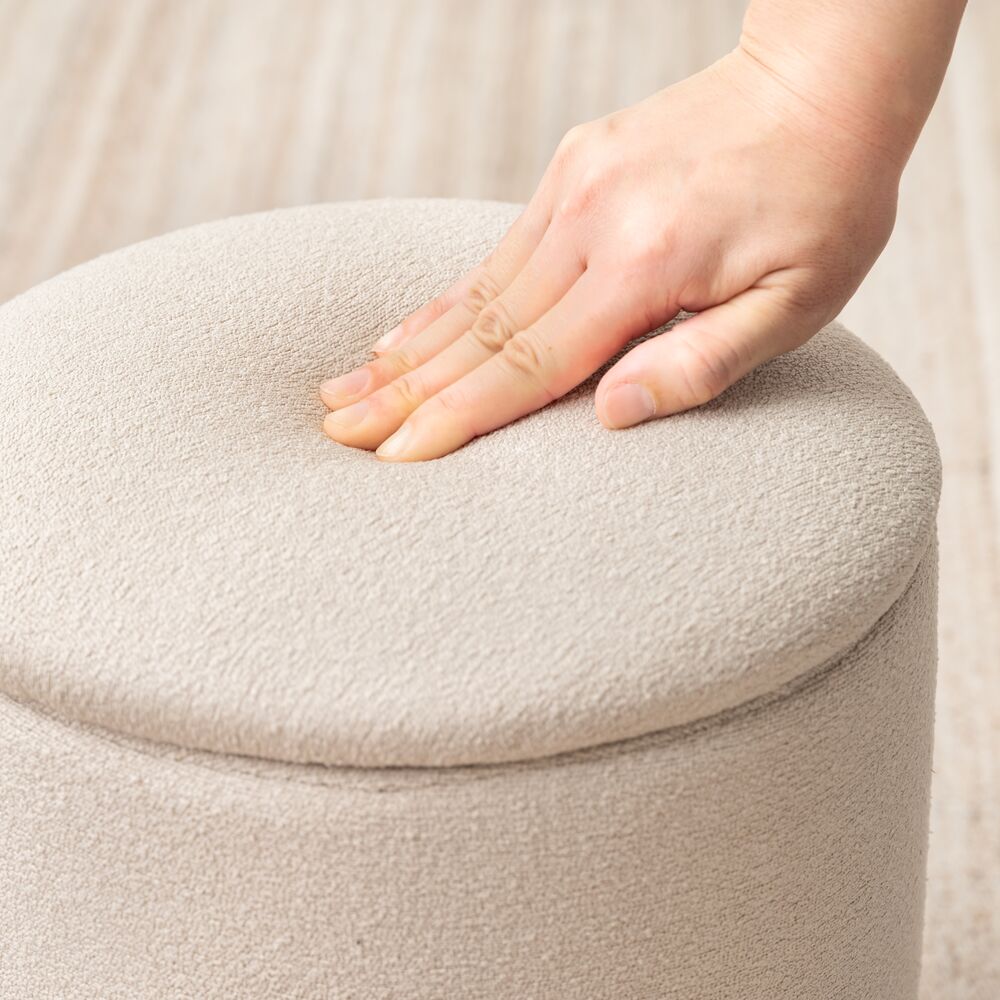 丸みを帯びたフォルムと、優しい手触りのブークレ生地が愛らしい収納スツール。