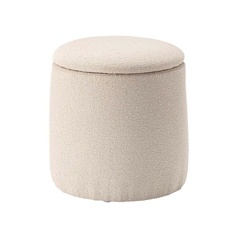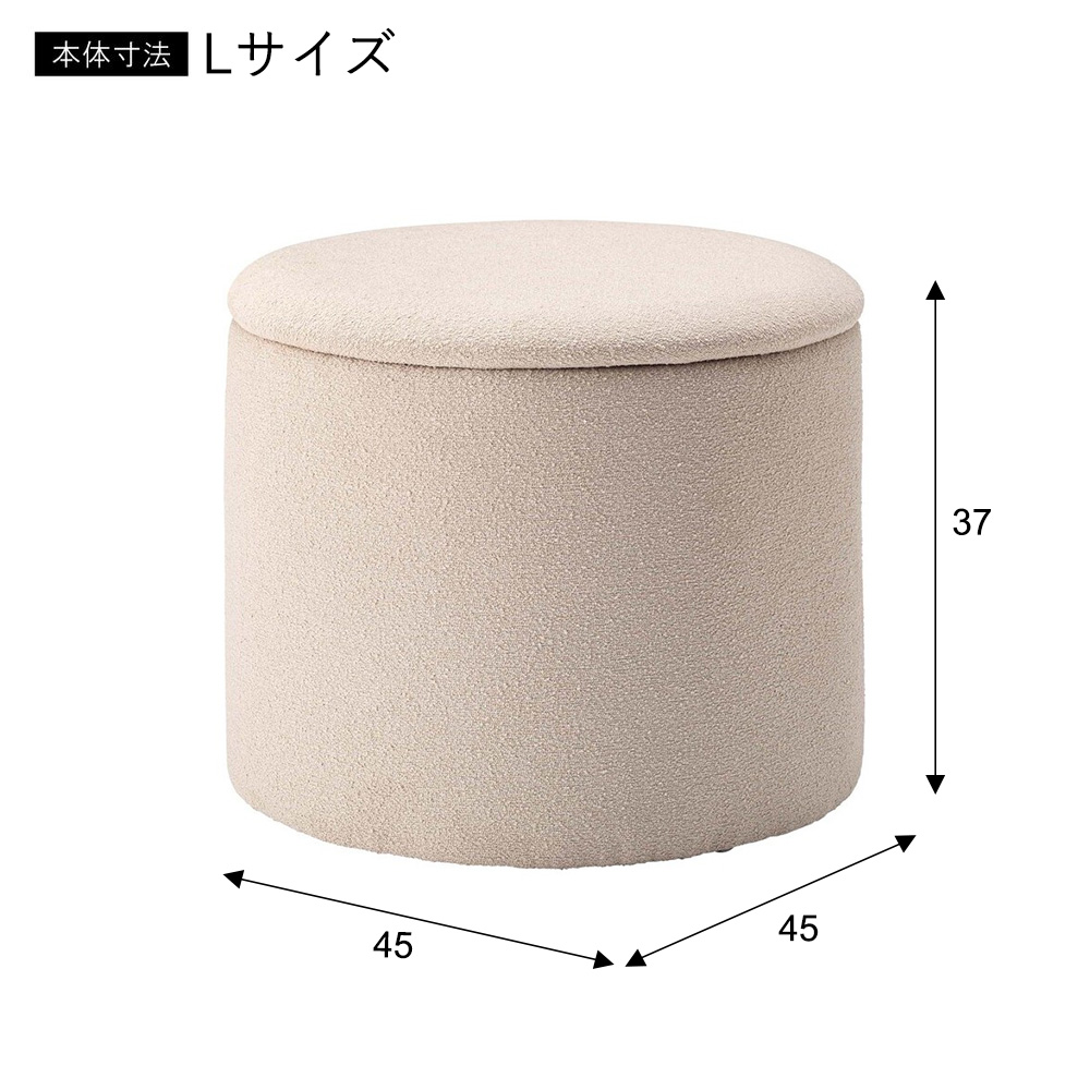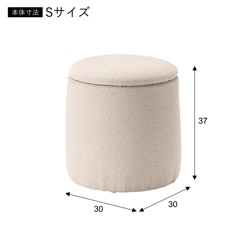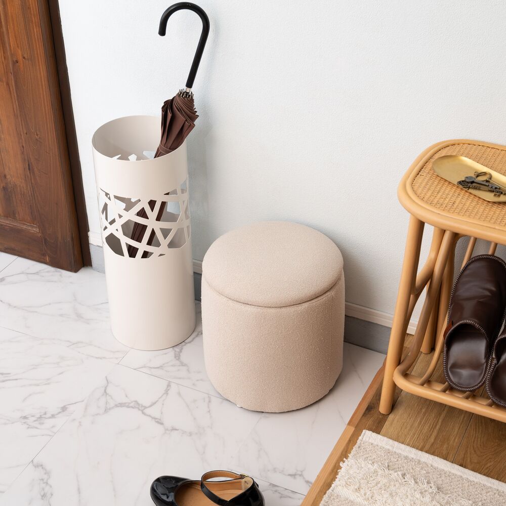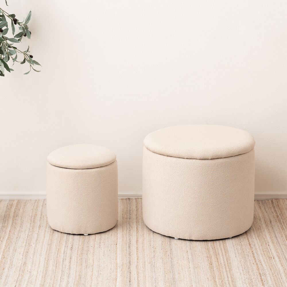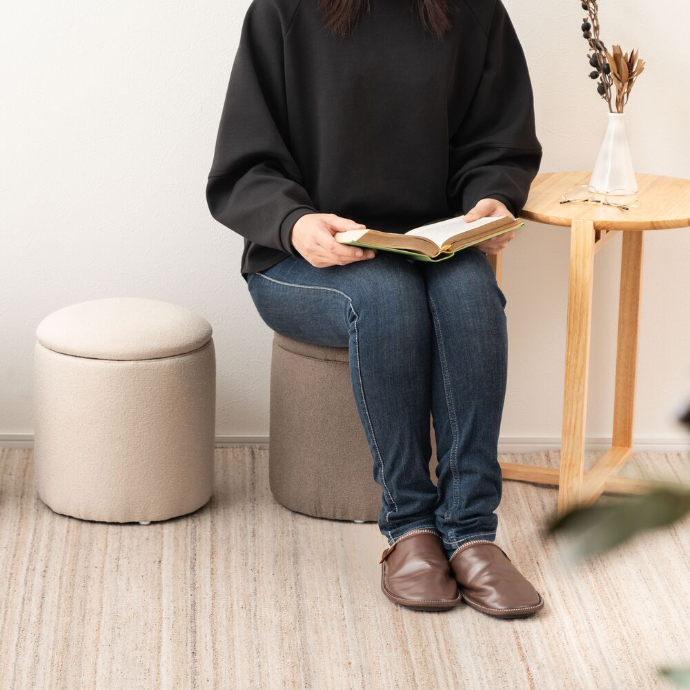 丸みを帯びたフォルムと、優しい手触りのブークレ生地が愛らしい収納スツール。