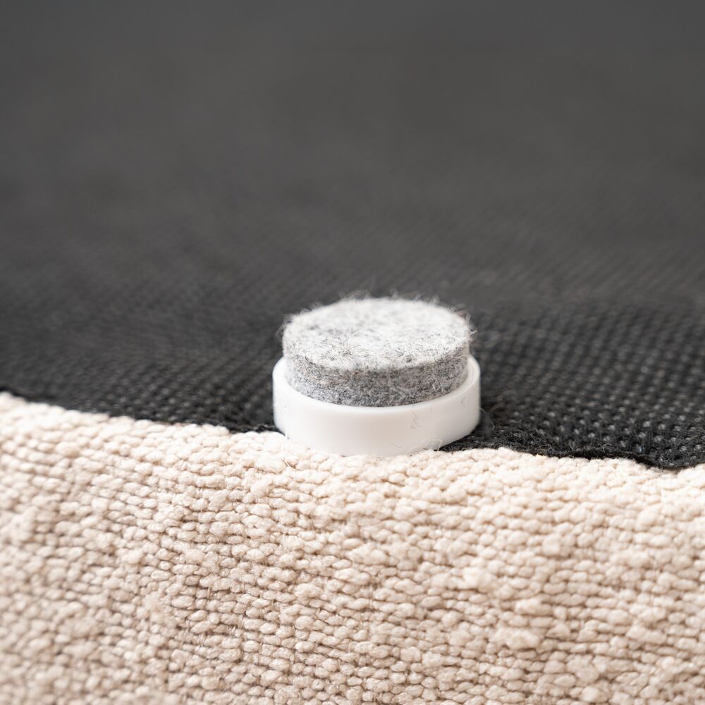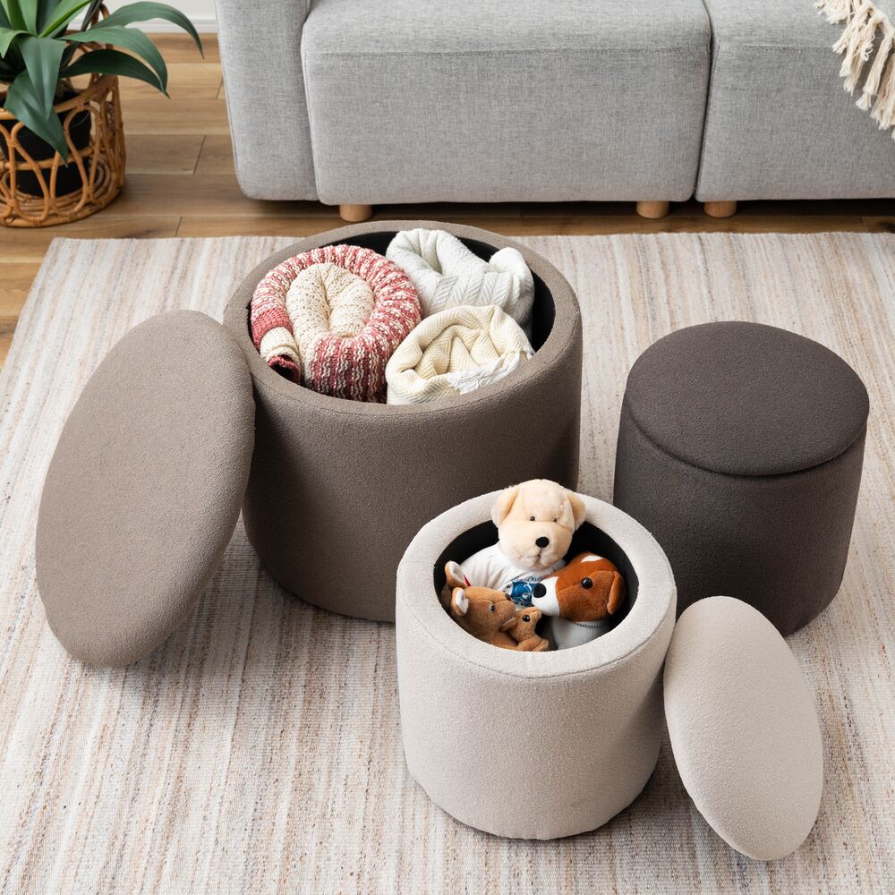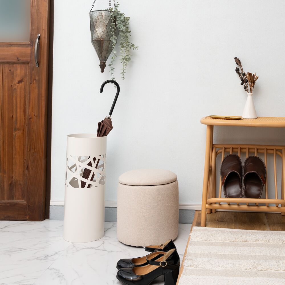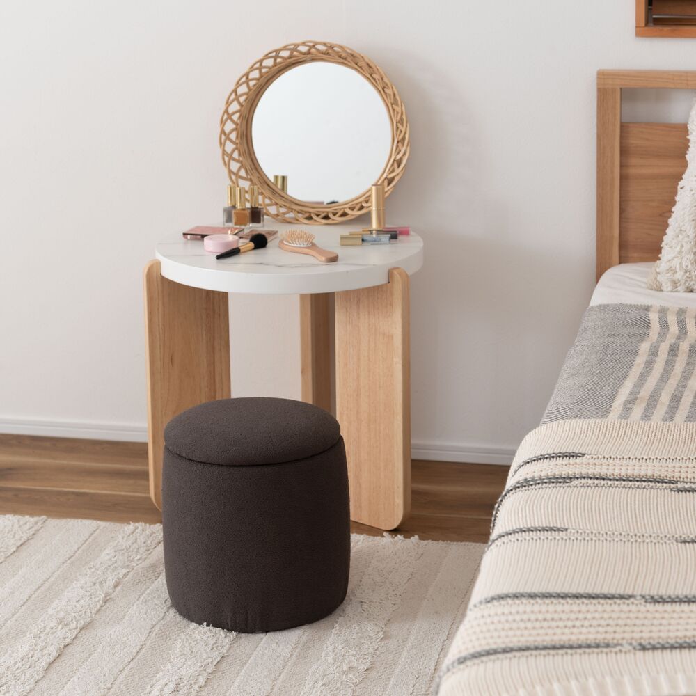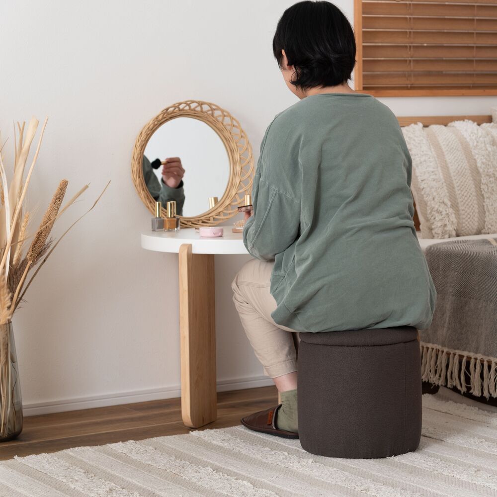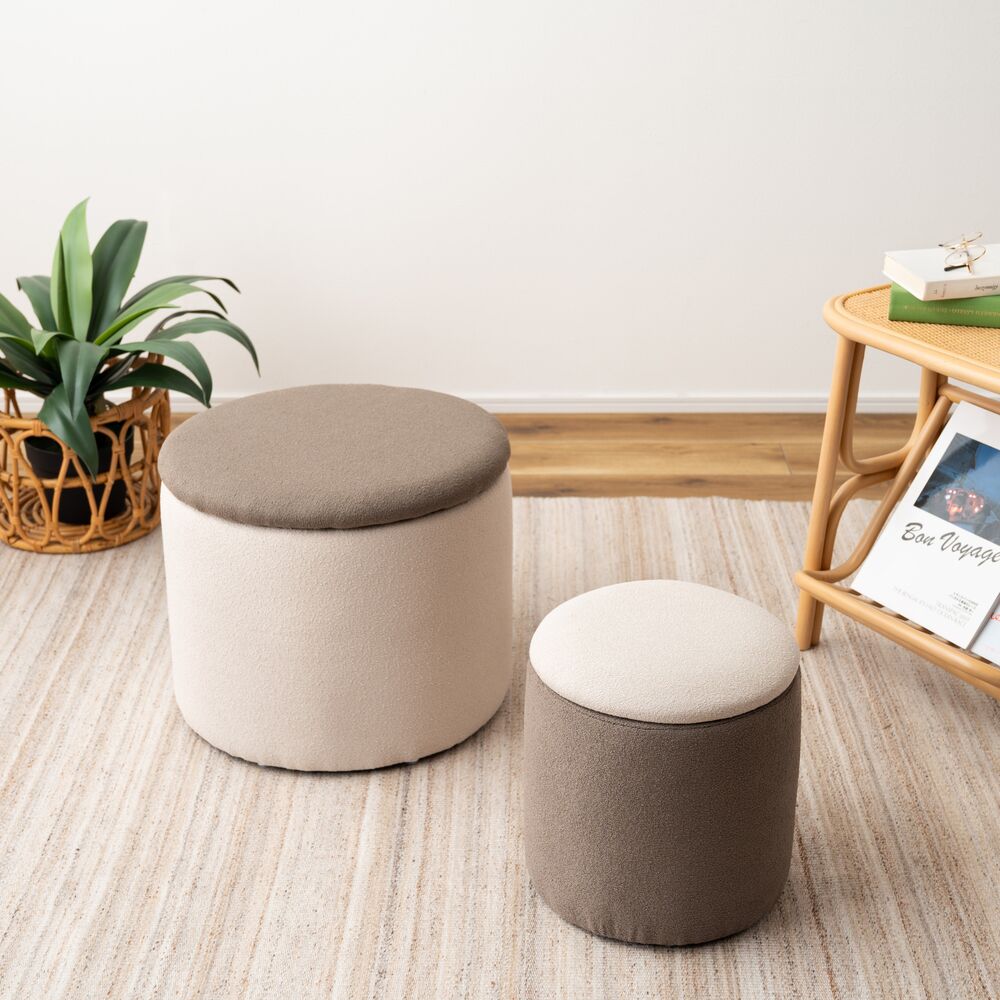 丸みを帯びたフォルムと、優しい手触りのブークレ生地が愛らしい収納スツール。