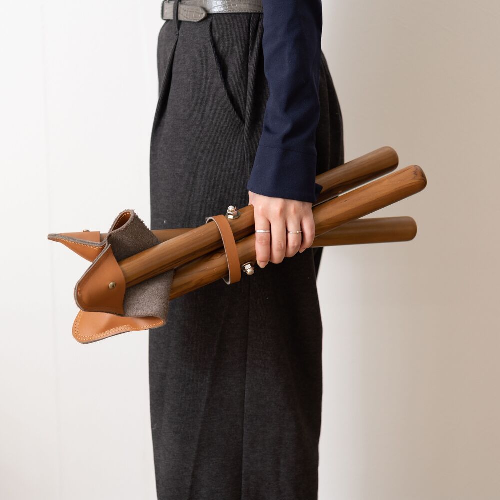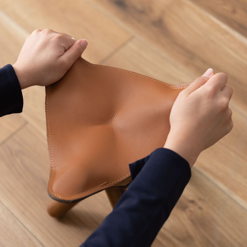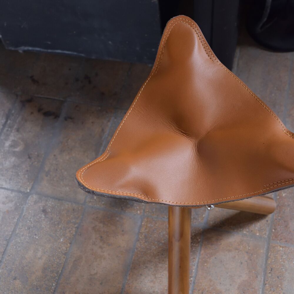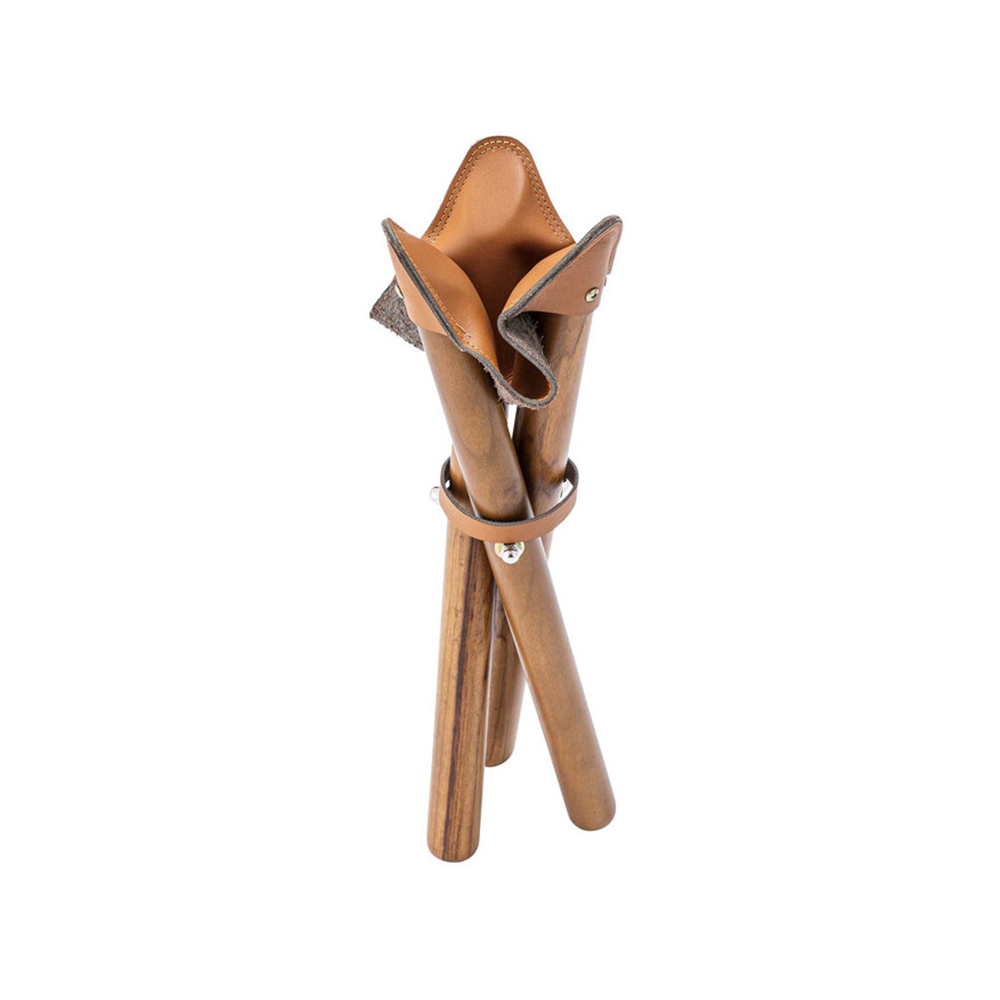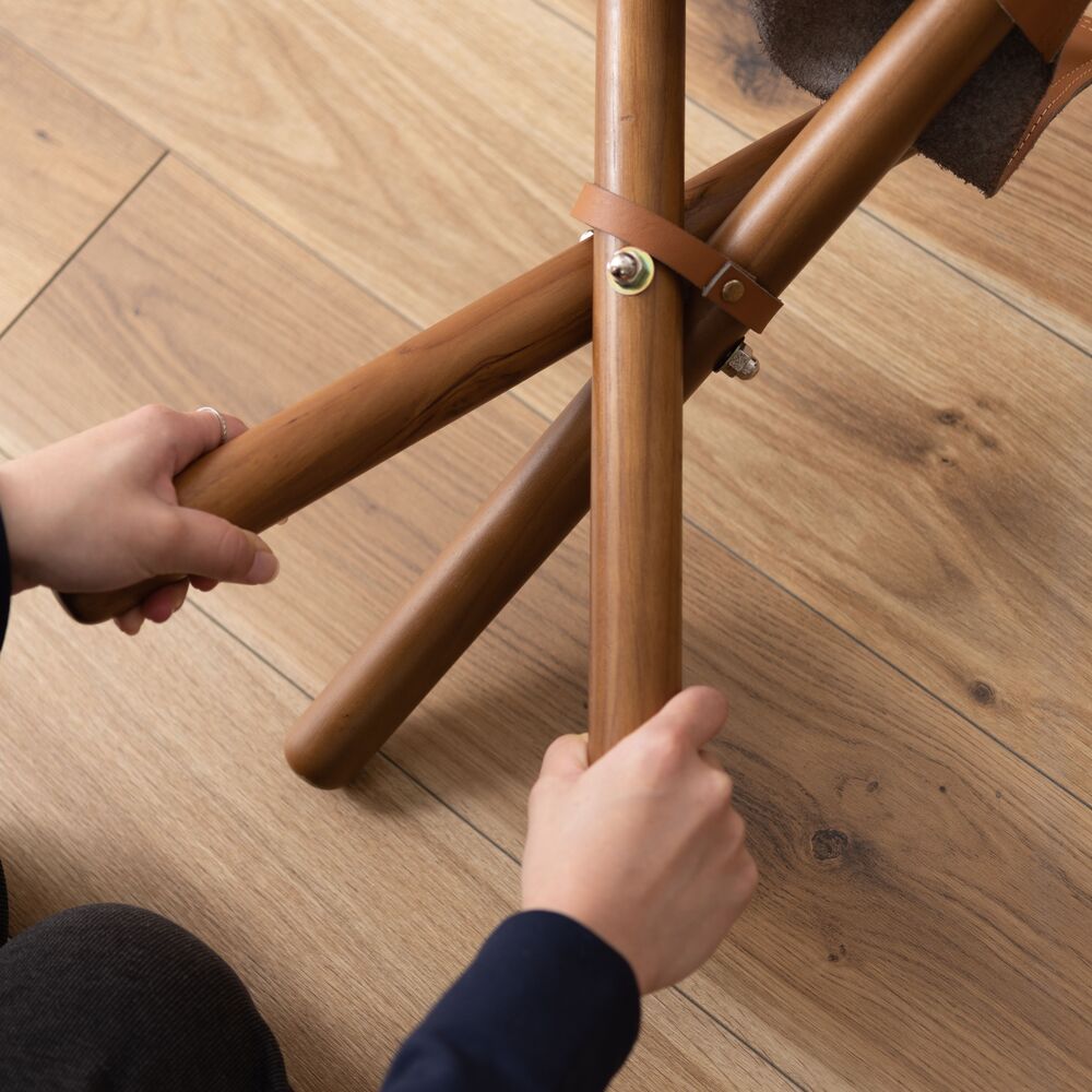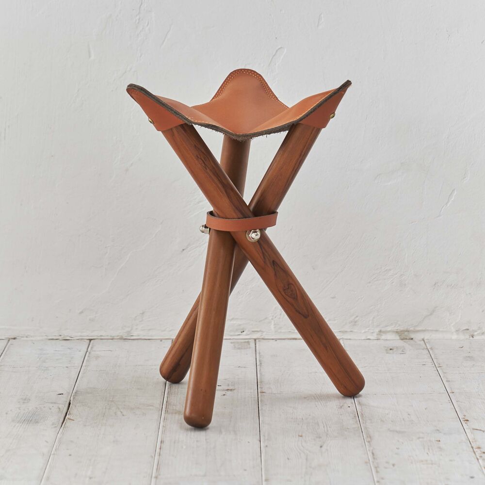天然木チークのフレームと、使うほどに味わいが増す本革の座面が織りなす、上質なフォールディングスツール。