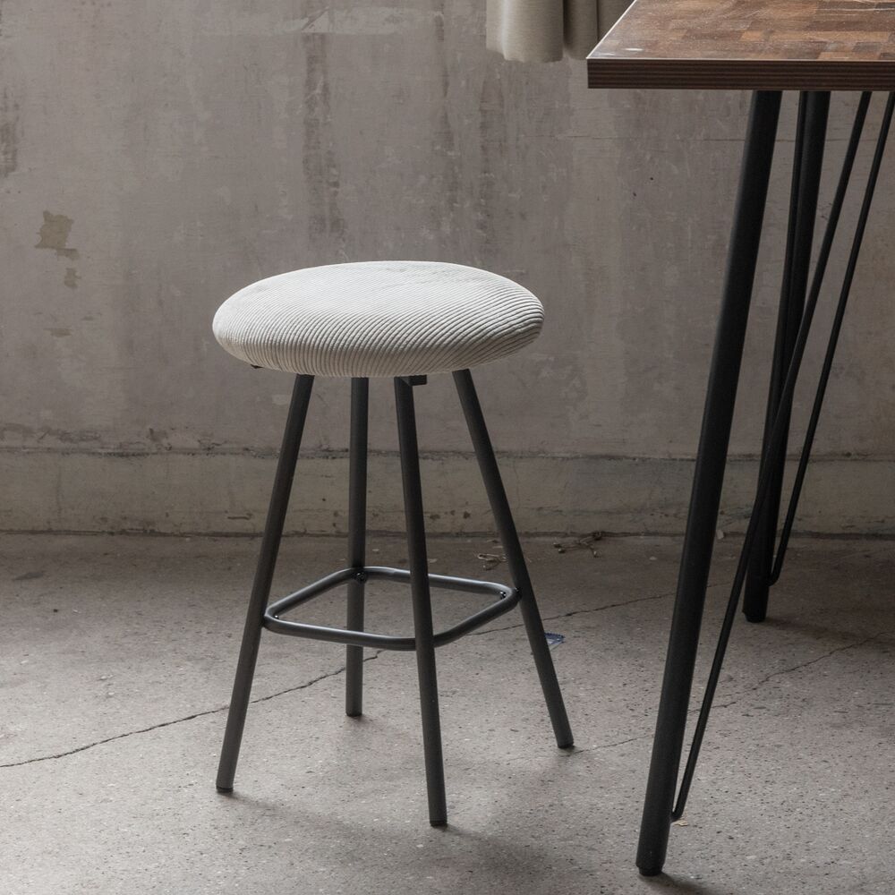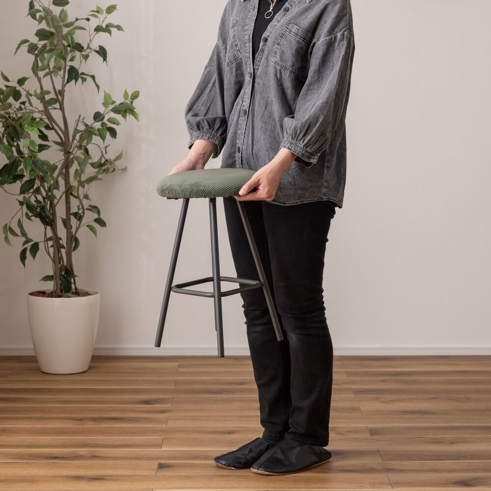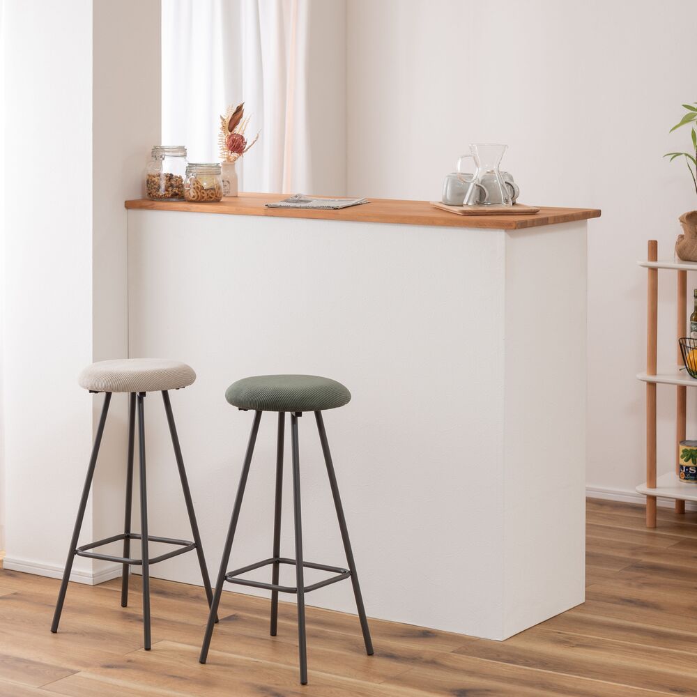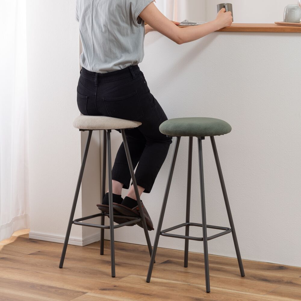 キッチンカウンターでの朝食や、デスクワークの合間の休憩にちょうどいい、コンパクトなサイズ感。座面にはクッション性があり、座り心地も快適です。