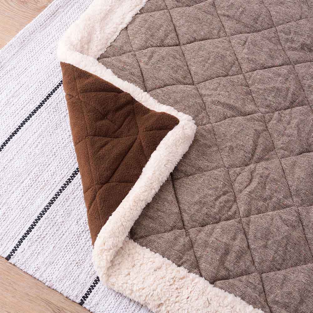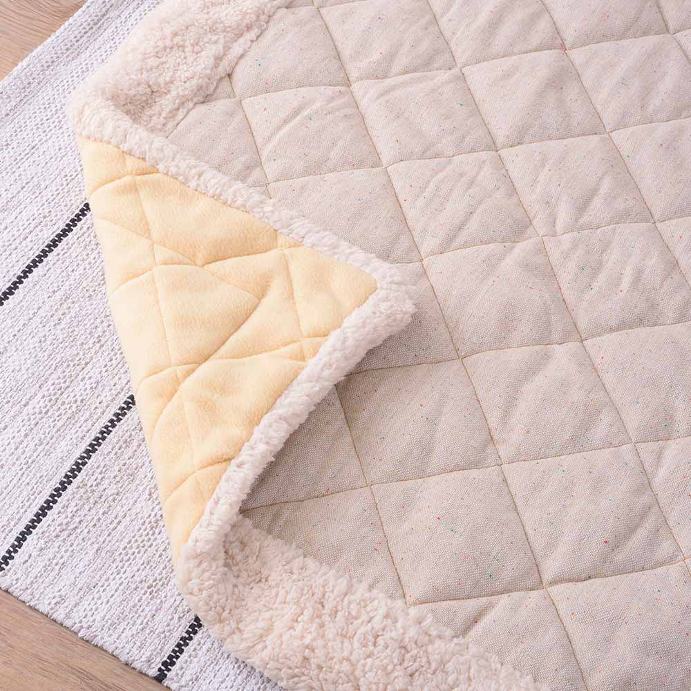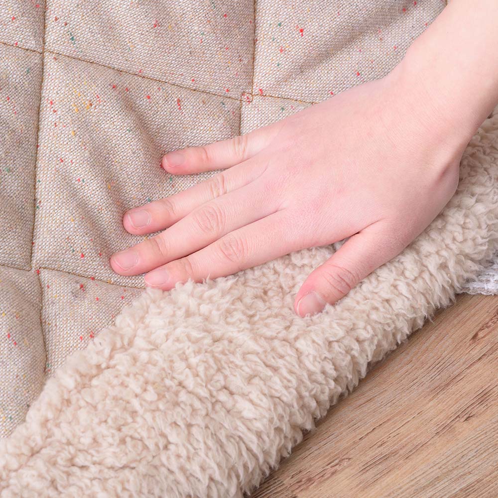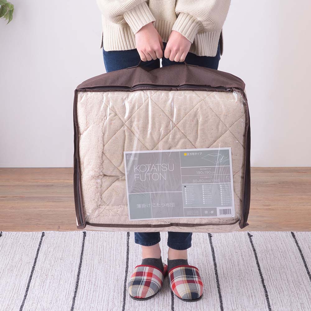 ツイード風の表地とふかふかボアの縁取りがかわいらしい、薄掛けタイプのこたつ布団です。