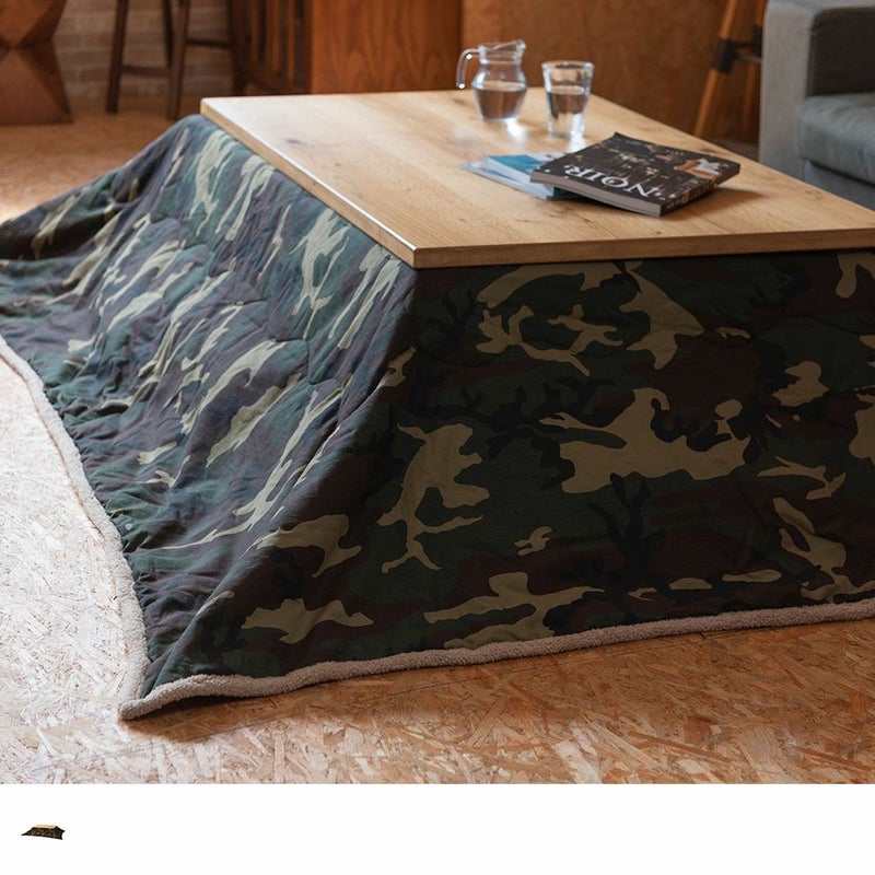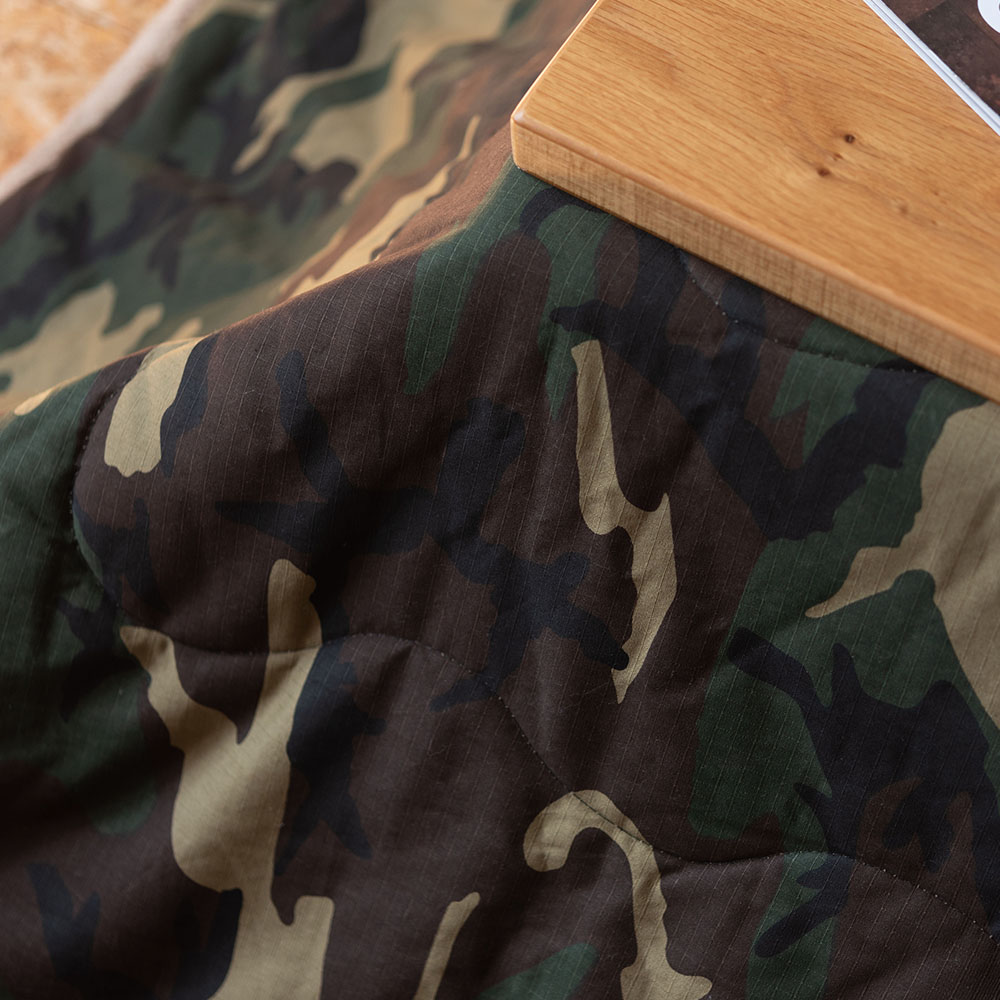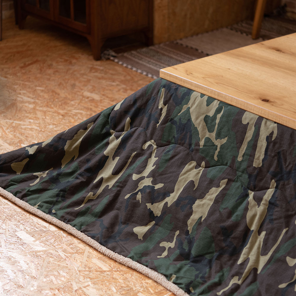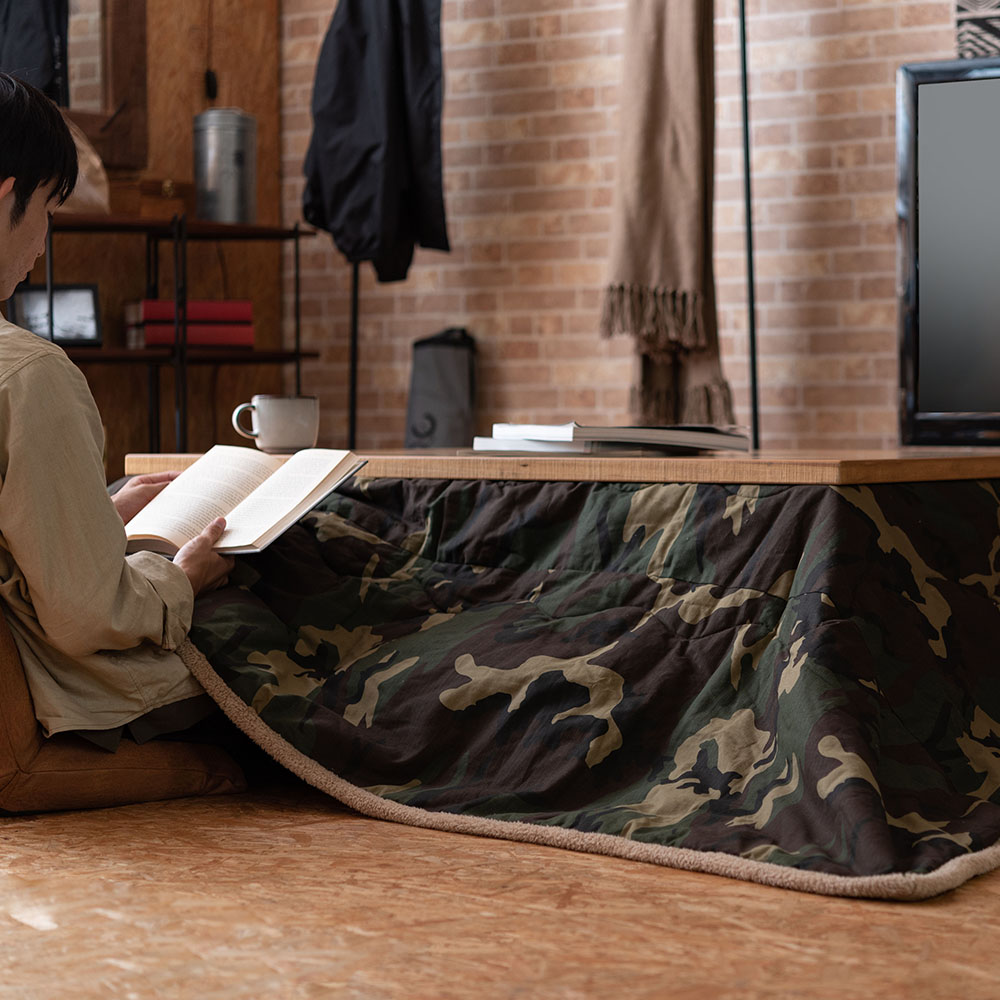 アウトドアの空気をそのままリビングに。 自然と都会をつなぐような迷彩柄のこたつ布団は、ラフでありながら存在感を放ちます。 内側はふんわりとしたボア仕様で、冷え込む冬の日も、包み込まれるような温もりで心地よく過ごせます。 遊び心のあるデザインは、ヴィンテージやインダストリアルなインテリアとも好相性。 まるでキャンプ気分で過ごすような、特別なリラックスタイムをお届けします。