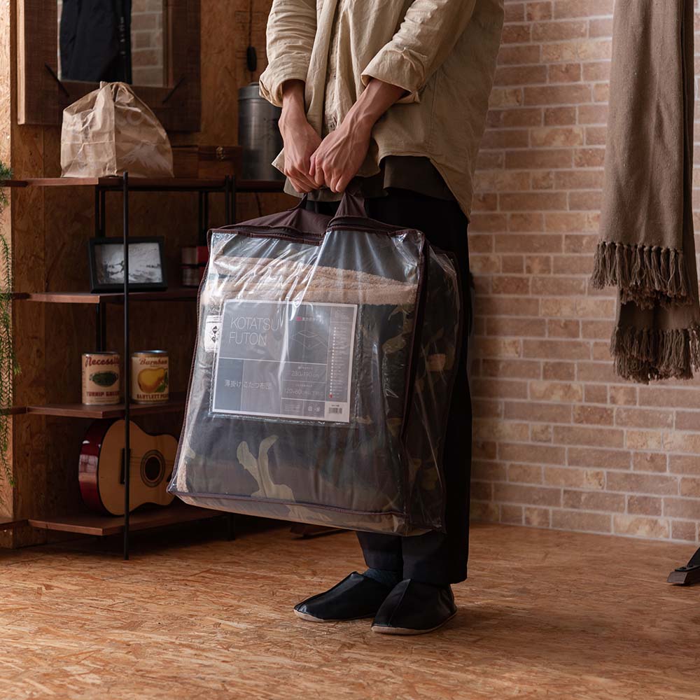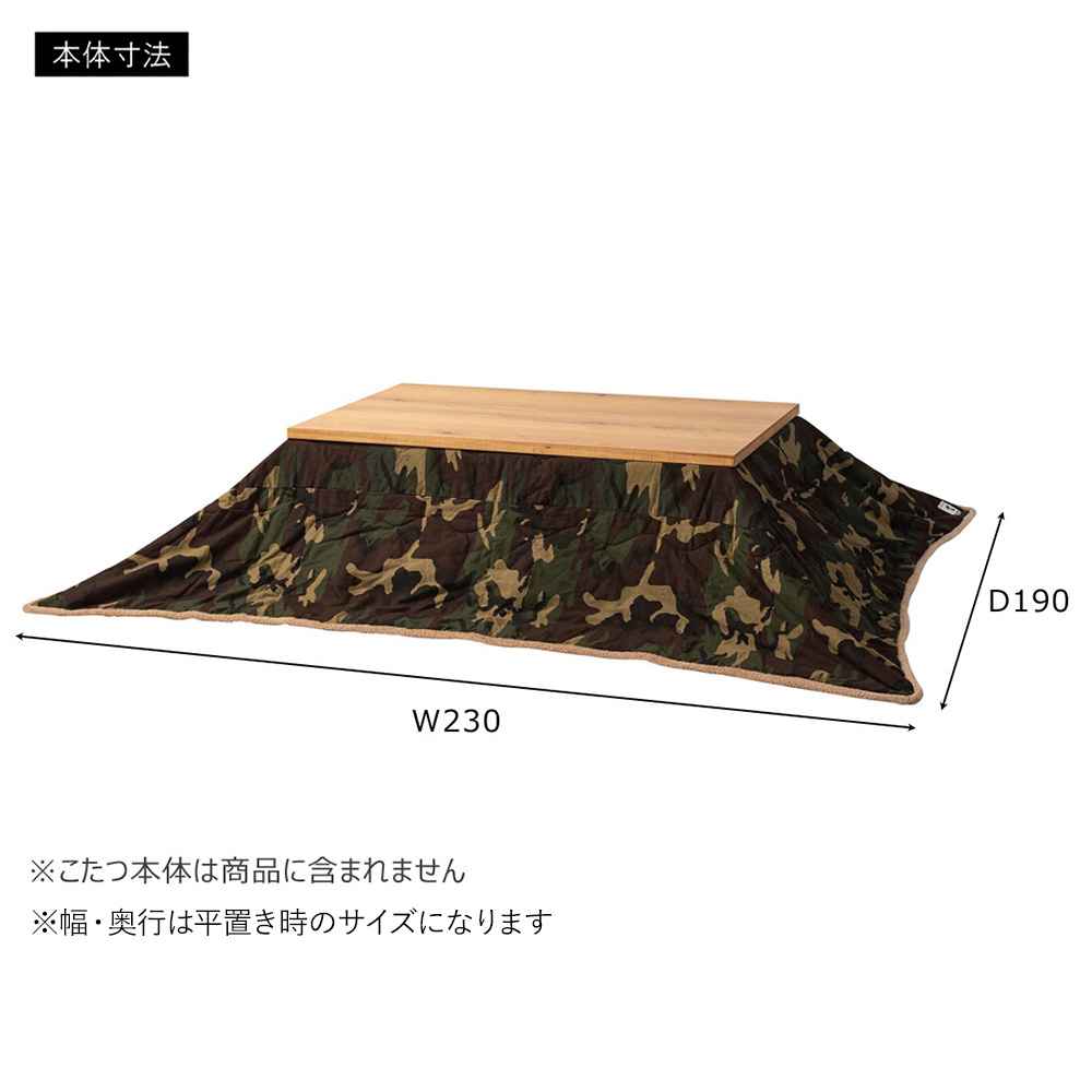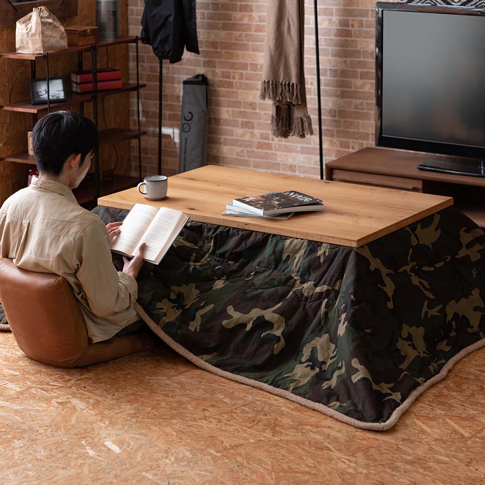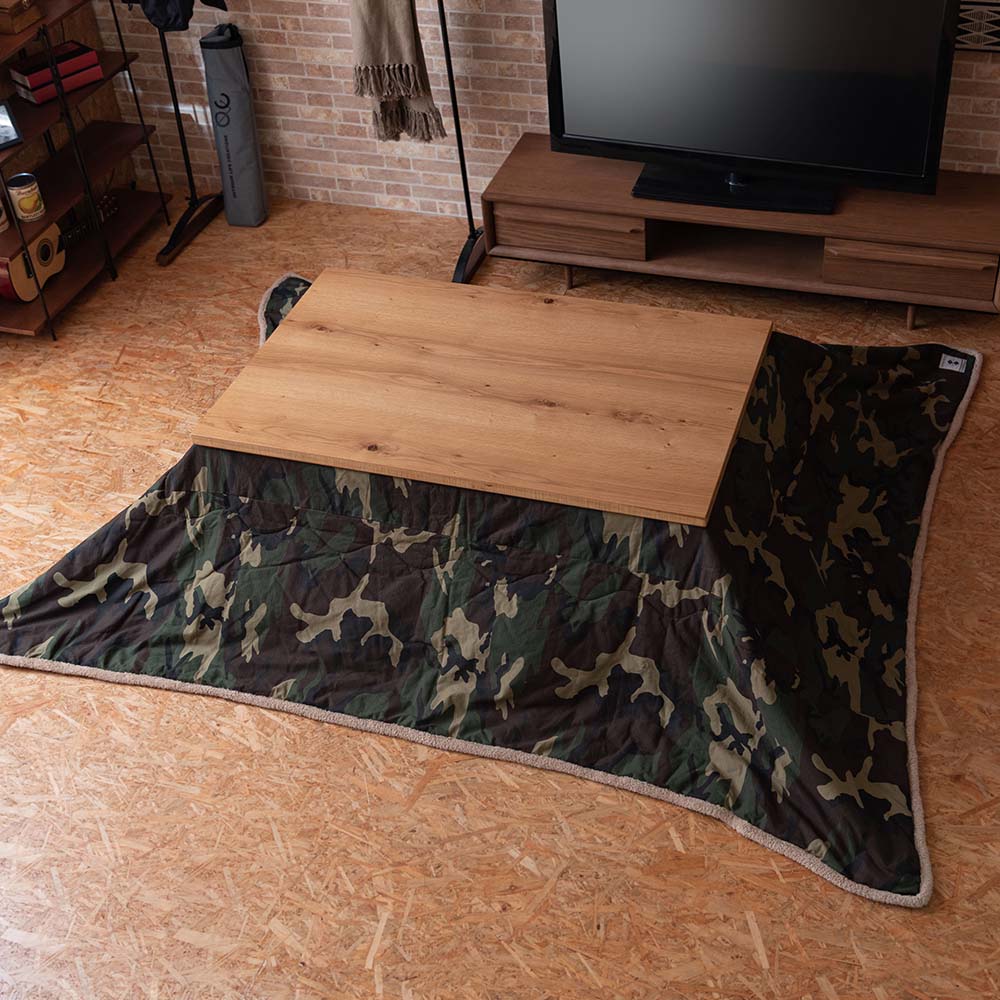 アウトドアの空気をそのままリビングに。 自然と都会をつなぐような迷彩柄のこたつ布団は、ラフでありながら存在感を放ちます。 内側はふんわりとしたボア仕様で、冷え込む冬の日も、包み込まれるような温もりで心地よく過ごせます。 遊び心のあるデザインは、ヴィンテージやインダストリアルなインテリアとも好相性。 まるでキャンプ気分で過ごすような、特別なリラックスタイムをお届けします。