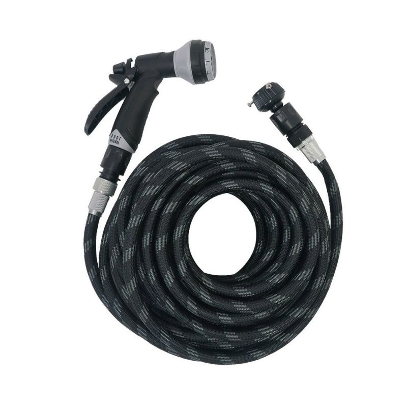 10種類の水流切り替えが出来る、多機能散水ノズル付きのガーデンホース。