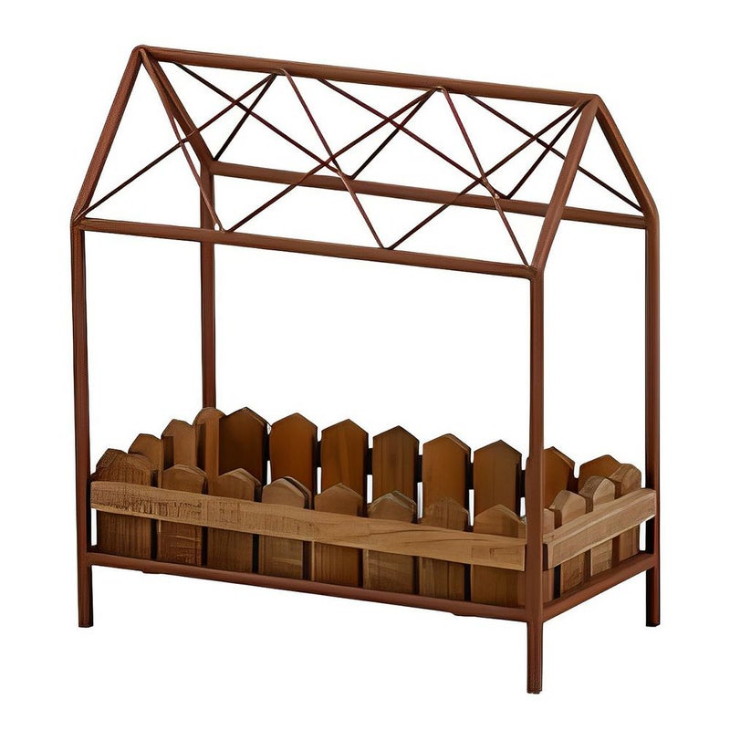 ナチュラルな木製のピケットフェンスに囲まれた、小さなハウス型のポットスタンドです。