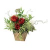 温かみのあるウッド製の花器から生命力あふれる花々が顔をのぞかせる、アーティフィシャルフラワーのアレンジメントです。
