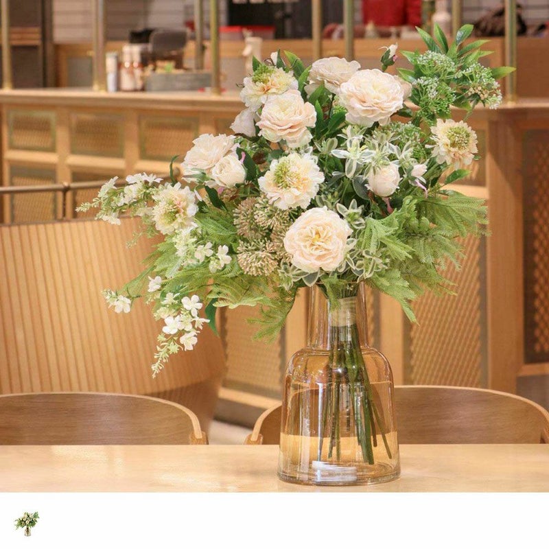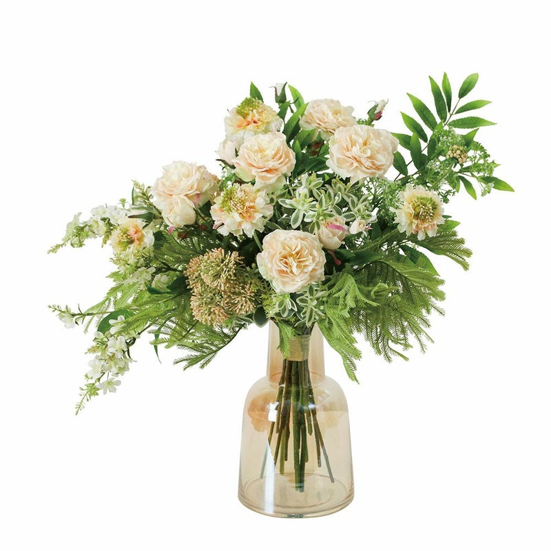 琥珀色のベースが花々の柔らかな色合いを一層引き立てます。繊細に重なる花びらと、瑞々しいグリーンが織りなすナチュラルな佇まいは、お部屋に穏やかな空気感を運びます。