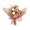 コーラルピンクのダリアや柔らかなローズを、落ち着いたくすみピンクで優しく包みました。甘すぎない上品な佇まいはリビングや寝室にもしっくりと馴染みます。