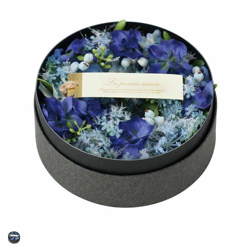 深く、吸い込まれそうなブルーの花々が、霧のように繊細な小花に縁どられた、美しいアーティフィシャルフラワーリース。クールな輝きを放つその知的な佇まいは、書斎や寝室を上質な空間へと演出。