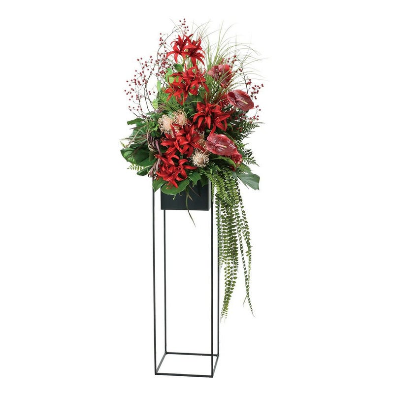 ミニマルなブラックスタンドから溢れるのは、燃えるような赤と生命力あふれるグリーン。シャープなラインを描くリリーや艶やかなアンスリウムが、エキゾチックで情熱的なムードを演出します。しなやかに垂れるシダのグリーンがドラマチックな動きをプラス。