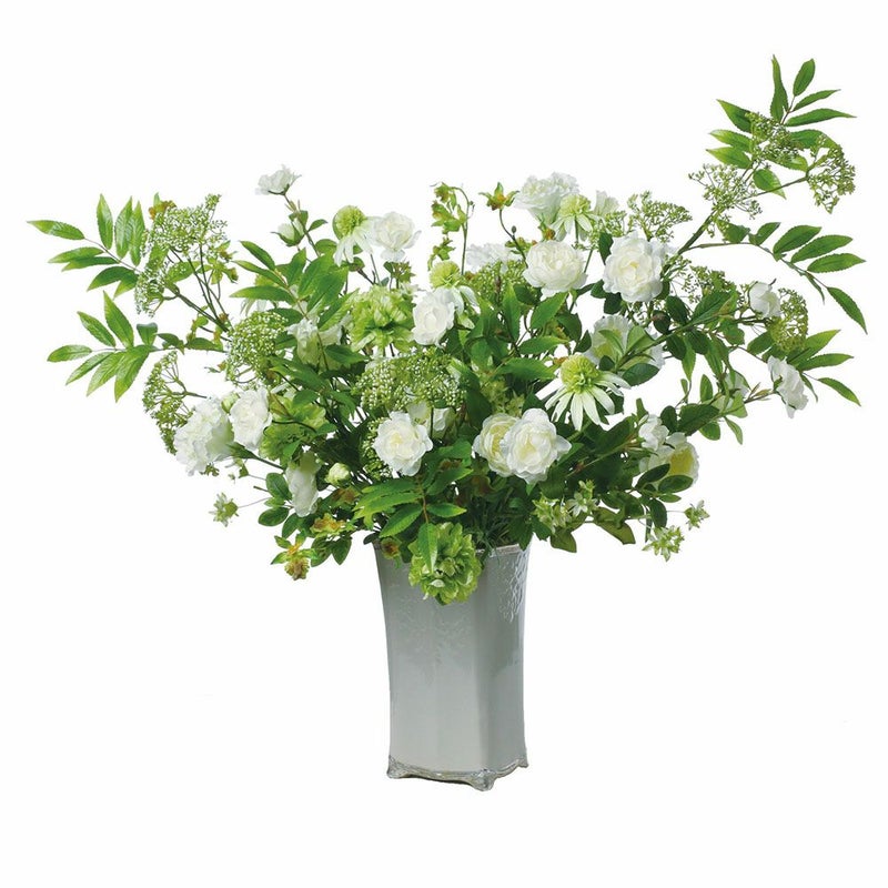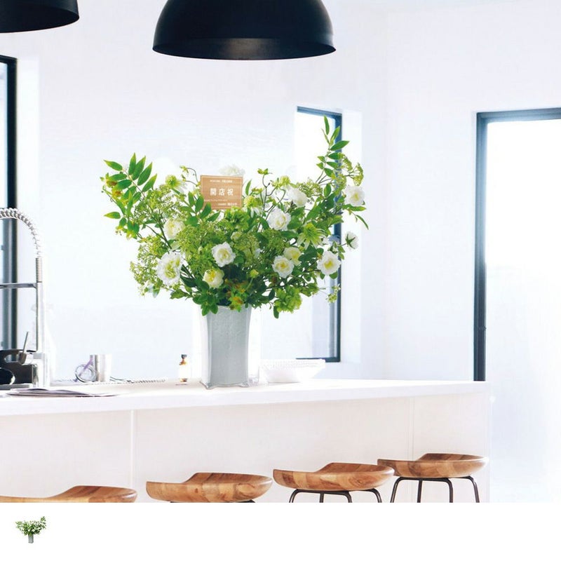 白いローズと様々なグリーンを束ねた、ナチュラルで生命力あふれるアーティフィシャルフラワーアレンジメント。